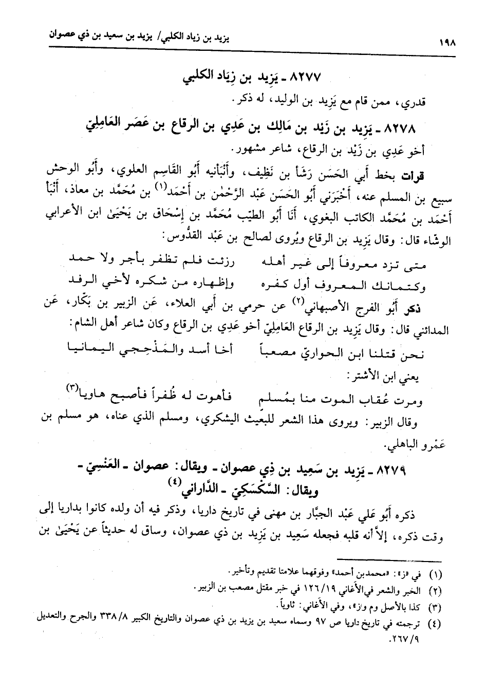8278 - يزيد بن زيد بن مالك بن عدي بن الرقاع بن عصر العاملي أخو عدي بن زيد بن الرقاع شاعر مشهور قرأت بخط أبي الحسن رشأ بن نظيف وأنبأنيه أبو القاسم العلوي وأبو الوحش سبيع بن المسلم عنه أخبرني أبو الحسن عبد الرحمن بن احمد (1) بن محمد بن معاذ أنبأ أحمد بن محمد الكاتب البغوي أنا أبو الطيب محمد بن إسحاق بن يحيى ابن الأعرابي الوشاء قال وقال يزيد بن الرقاع ويروى لصالح بن عبد القدوس متى تزد معروفا إلى غير أهله * رزئت فلم تظفر بأجر ولا حمد وكتمانك المعروف أول كفره * وإظهاره من شكره لأخي الرفد * ذكر أبو الفرج الأصبهاني (2) عن حرمي بن أبي العلاء عن الزبير بن بكار عن المدائني قال وقال يزيد بن الرقاع العاملي أخو عدي بن الرقاع وكان شاعر أهل الشام نحن قتلنا ابن الحواري مصعبا * أخا أسد والمذحجي اليمانيا * يعني ابن الأشتر ومرت عقاب الموت منا بمسلم * فأهوت له ظفرا فأصبح هاويا (3) * وقال الزبير ويروى هذا الشعر للبعيث اليشكري ومسلم الذي عناه هو مسلم بن عمرو الباهلي