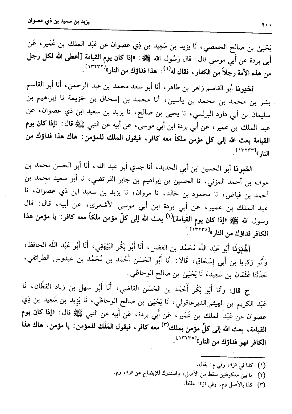 يحيى بن صالح الحمصي نا يزيد بن سعيد بن ذي عصوان عن عبد الملك بن عمير عن أبي بردة عن أبي موسى قال قال رسول الله (صلى الله عليه وسلم) إذا كان يوم القيامة أعطى الله لكل رجل من هذه الأمة رجلا من الكفار فقال له (1) هذا فداؤك من النار أخبرنا أبو القاسم زاهر بن طاهر أنا أبو سعد محمد بن عبد الرحمن أنا أبو القاسم بشر بن محمد بن محمد بن ياسين أنا محمد بن إسحاق بن خزيمة نا إبراهيم بن سليمان بن أبي داود البرلسي نا يحيى بن صالح نا يزيد بن سعيد ابن ذي عصوان عن عبد الملك بن عمير عن أبي بردة ابن أبي موسى عن أبيه عن النبي (صلى الله عليه وسلم) قال إذا كان يوم القيامة بعث الله إلى كل مؤمن ملكا معه كافر فيقول الملك للمؤمن هاك هذا فداؤك من النار [* *] أخبرنا أبو الحسين ابن أبي الحديد أنا جدي أبو عبد الله أنا أبو الحسن محمد بن عوف بن أحمد المزني نا الحسين بن إبراهيم بن جابر الفرائضي نا أبو سعيد محمد بن أحمد بن فياض نا محمود بن خالد نا مروان نا يزيد بن سعيد ابن ذي عصوان نا عبد الملك بن عمير عن أبي بردة ابن أبي موسى الأشعري عن أبيه قال قال رسول الله (صلى الله عليه وسلم) إذا كان يوم القيامة (2) بعث الله إلى كل مؤمن ملكا معه كافر يا مؤمن هذا الكافر فداؤك من النار أخبرنا أبو عبد الله محمد بن الفضل أنا أبو بكر البيهقي أنا أبو عبد الله الحافظ وأبو زكريا بن أبي إسحاق قالا أنا أبو الحسن أحمد بن محمد بن عبدوس الطرائفي حدثنا عثمان بن سعيد نا يحيى بن صالح الوحاظي ح قال وأنا أبو بكر أحمد بن الحسن القاضي أنا أبو سهل بن زياد القطان نا عبد الكريم بن الهيثم الدير عاقولي نا يحيى بن صالح الوحاظي نا يزيد بن سعيد بن ذي عصوان عن عبد الملك بن عمير عن أبي بردة عن أبيه عن النبي (صلى الله عليه وسلم) قال إذا كان يوم القيامة بعث الله إلى كل مؤمن بملك (3) معه كافر فيقول الملك للمؤمن يا مؤمن هاك هذا الكافر فهو فداؤك من النار