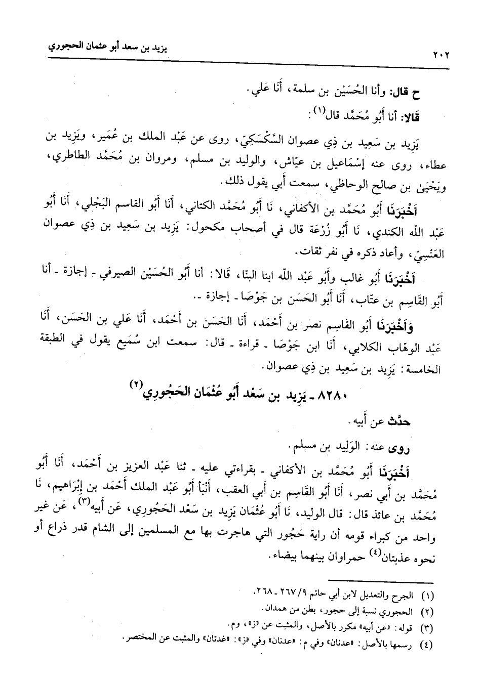 8280 - يزيد بن سعد أبو عثمان الحجوري (2) حدث عن أبيه روى عنه الوليد بن مسلم أخبرنا أبو محمد بن الأكفاني بقراءتي عليه ثنا عبد العزيز بن أحمد أنا أبو محمد بن أبي نصر أنا أبو القاسم بن أبي العقب أنبأ أبو عبد الملك أحمد بن إبراهيم نا محمد بن عائذ قال قال الوليد نا أبو عثمان يزيد بن سعد الحجوري عن أبيه (3) عن غير واحد من كبراء قومه أن راية حجور التي هاجرت بها مع المسلمين إلى الشام قدر ذراع أو نحوه عذبتان حمراوان بينهما بيضاء