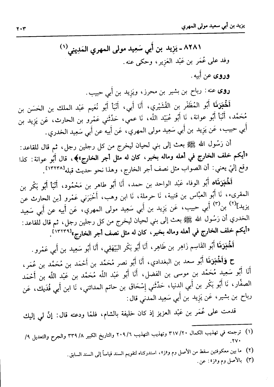 8281 - يزيد بن أبي سعيد مولى المهري المديني (1) وفد على عمر بن عبد العزيز وحكى عنه وروى عن أبيه روى عنه رباح بن بشير بن محرز ويزيد بن أبي حبيب أخبرنا أبو المظفر بن القشيري أنا أبي أنبأ أبو نعيم عبد الملك بن الحسن بن محمد أنبأ أبو عوانة نا أبو عبيد الله نا عمي حدثني عمرو بن الحارث عن يزيد بن أبي حبيب عن يزيد بن أبي سعيد مولى المهري عن أبيه عن أبي سعيد الخدري أن رسول الله (صلى الله عليه وسلم) بعث إلى بني لحيان ليخرج من كل رجلين رجل ثم قال للقاعد أيكم خلف الخارج في أهله وماله بخير كان له مثل أجر الخارج قال أبو عوانة كذا وقع إلي يعني أن الصواب مثل نصف أجر الخارج وهذا نحو حديث قبله أخبرناه أبو الوفاء عبد الواحد بن حمد أنا أبو طاهر بن محمود أنبأ أبو بكر بن المقرئ نا أبو العباس بن قتيبة نا حرملة نا ابن وهب أخبرني عمرو بن الحارث عن يزيد (2) بن (3) أبي حبيب عن يزيد بن أبي سعيد مولى المهري عن أبيه عن أبي سعيد الخدري أن رسول الله (صلى الله عليه وسلم) بعث إلى بني لحيان ليخرج من كل رجلين رجل ثم قال للقاعد أيكم خلف الخارج في أهله وماله بخير كان له مثل نصف أجر الخارج أخبرنا أبو القاسم زاهر بن طاهر أنا أبو بكر البيهقي أنا أبو سعيد بن أبي عمرو ح وأخبرنا أبو سعد بن البغدادي أنا أبو نصر محمد بن أحمد بن محمد بن عمر أنا أبو سعيد محمد بن موسى بن الفضل أنا أبو عبد الله محمد بن عبد الله بن أحمد الصفار نا أبو بكر بن أبي الدنيا حدثني إسحاق بن حاتم المدائني نا ابن أبي فديك عن رباح بن بشير عن يزيد بن أبي سعيد المدني قال قدمت على عمر بن عبد العزيز إذ كان خليفة بالشام فلما ودعته قال إن لي إليك