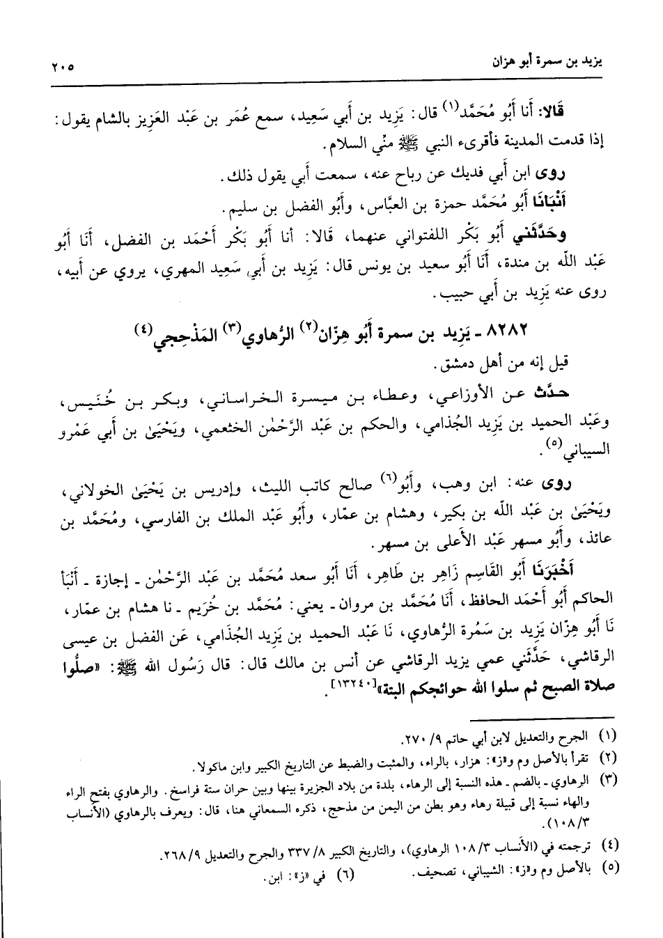 8282 - يزيد بن سمرة أبو هزان (2) الرهاوي (3) المذحجي (4) قيل إنه من أهل دمشق حدث عن الأوزاعي وعطاء بن ميسرة الخراساني وبكر بن خنيس وعبد الحميد بن يزيد الجذامي والحكم بن عبد الرحمن الخثعمي ويحيى بن أبي عمرو السيباني (5) روى عنه ابن وهب وأبو (6) صالح كاتب الليث وإدريس بن يحيى الخولاني ويحيى بن عبد الله بن بكير وهشام بن عمار وأبو عبد الملك بن الفارسي ومحمد بن عائذ وأبو مسهر عبد الأعلى بن مسهر أخبرنا أبو القاسم زاهر بن طاهر أنا أبو سعد محمد بن عبد الرحمن إجازة أنبأ الحاكم أبو أحمد الحافظ أنا محمد بن مروان يعني محمد بن خريم نا هشام بن عمار نا أبو هزان يزيد بن سمرة الرهاوي نا عبد الحميد بن يزيد الجذامي عن الفضل بن عيسى الرقاشي حدثني عمي يزيد الرقاشي عن أنس بن مالك قال قال رسول الله (صلى الله عليه وسلم) صلوا صلاة الصبح ثم سلوا الله حوائجكم البتة