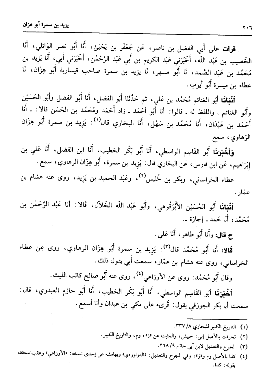 قرأت على أبي الفضل بن ناصر عن جعفر بن يحيى أنا أبو نصر الوائلي أنا الخصيب بن عبد الله أخبرني عبد الكريم بن أبي عبد الرحمن أخبرني أبي أنا يزيد بن محمد بن عبد الصمد نا أبو مسهر نا يزيد بن سمرة صاحب قيسارية أبو هزان نا عطاء بن ميسرة أبو أيوب أنبأنا أبو الغنائم محمد بن علي ثم حدثنا أبو الفضل أنا أبو الفضل وأبو الحسين وأبو الغنائم واللفظ له قالوا أنا أبو أحمد زاد أحمد ومحمد بن الحسن قالا أنا أحمد بن عبدان أنا محمد بن سهل أنا البخاري قال (1) يزيد بن سمرة أبو هزان الرهاوي سمع وأخبرنا أبو القاسم الواسطي أنا أبو بكر الخطيب أنا ابن الفضل أنا علي بن إبراهيم عن ابن فارس عن البخاري قال يزيد بن سمرة أبو هزان الرهاوي سمع عطاء الخراساني وبكر بن خنيس (2) وعبد الحميد بن يزيد روى عنه هشام بن عمار أنبأنا أبو الحسين الأبرقوهي وأبو عبد الله الخلال قالا أنا عبد الرحمن بن محمد أنا حمد إجازة ح قال وأنا أبو طاهر أنا علي قالا أنا أبو محمد قال (3) يزيد بن سمرة أبو هزان الرهاوي روى عن عطاء الخراساني روى عنه هشام بن عمار سمعت أبي يقول ذلك وقال أبو محمد روى عن الأوزاعي (4) روى عنه أبو صالح كاتب الليث أخبرنا أبو القاسم الواسطي أنا أبو بكر الخطيب أنا أبو حازم العبدوي قال سمعت أبا بكر الجوزقي يقول قرئ على مكي بن عبدان وأنا أسمع