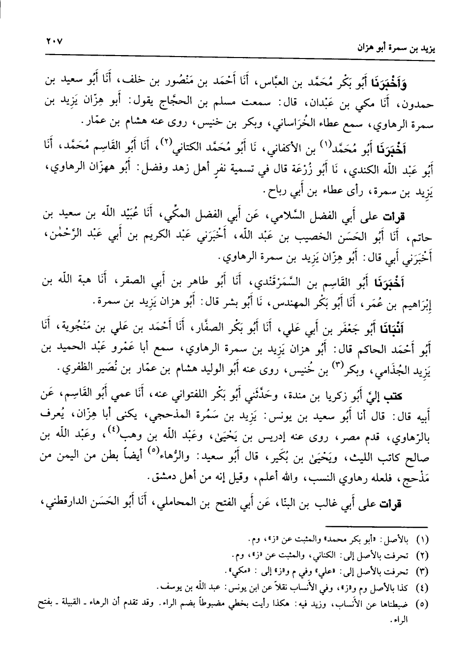 وأخبرنا أبو بكر محمد بن العباس أنا أحمد بن منصور بن خلف أنا أبو سعيد بن حمدون أنامكي بن عبدان قال سمعت مسلم بن الحجاج يقول أبو هزان يزيد بن سمرة الرهاوي سمع عطاء الخراساني وبكر بن خنيس روى عنه هشام بن عمار أخبرنا أبو محمد (1) بن الأكفاني نا أبو محمد الكتاني (2) أنا أبو القاسم محمد أنا أبو عبد الله الكندي نا أبو زرعة قال في تسمية نفر أهل زهد وفضل أبو ههزان الرهاوي يزيد بن سمرة رأى عطاء بن أبي رباح قرأت على أبي الفضل السلامي عن أبي الفضل المكي أنا عبيد الله بن سعيد بن حاتم أنا أبو الحسن الخصيب بن عبد الله أخبرني عبد الكريم بن أبي عبد الرحمن أخبرني أبي قال أبو هزان يزيد بن سمرة الرهاوي أخبرنا أبو القاسم بن السمرقندي أنا أبو طاهر بن أبي الصقر أنا هبة الله بن إبراهيم بن عمر أنا أبو بكر المهندس نا أبو بشر قال أبو هزام يزيد بن سمرة أنبأنا أبو جعفر بن أبي علي أنا أبو بكر الصفار أنا أحمد بن علي بن منجوية أنا أبو أحمد الحاكم قال أبو هزان يزيد بن سمرة الرهاوي سمع أبا عمرو عبد الحميد بن يزيد الجذامي وبكر (3) بن خنيس روى عنه أبو الوليد هشام بن عمار بن نصير الظفري كتب إلي أبو زكريا بن مندة وحدثني أبو بكر اللفتواني عنه أنا عمي أبو القاسم عن أبيه قال قال أنا أبو سعيد بن يونس يزيد بن سمرة المذحجي يكنى أبا هزان يعرف بالرهاوي قدم مصر روى عنه إدريس بن يحيى وعبد الله بن وهب (4) وعبد الله بن صالح كاتب الليث ويحيى بن بكير قال أبو سعيد والرهاء (5) أيضا بطن من اليمن من مذحج فلعله رهاوي النسب والله أعلم وقيل إنه من أهل دمشق قرأت على أبي غالب بن البنا عن أبي الفتح بن المحاملي أنا أبو الحسن الدارقطني