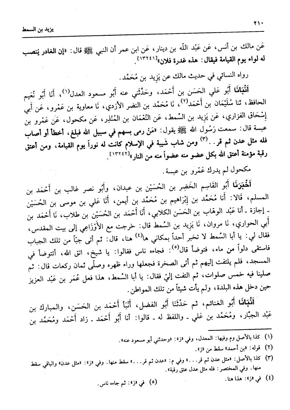 عن مالك بن أنس عن عبد الله بن دينار عن ابن عمر أن النبي (صلى الله عليه وسلم) قال إن الغادر ينصب له لواء يوم القيامة فيقال هذه غدرة فلان رواه النسائي في حديث مالك عن يزيد بن محمد أنبأنا أبو علي الحسن بن أحمد وحدثني عنه أبو مسعود العدل (1) أنا أبو نعيم الحافظ ثنا سليمان بن أحمد (2) نا محمد بن النضر الأزدي نا معاوية بن عمرو عن أبي إسحاق الفزاري عن يزيد بن السمط عن النعمان بن المنذر عن مكحول عن عمرو بن عبسة قال سمعت رسول الله (صلى الله عليه وسلم) يقول من رمى بسهم في سبيل الله فبلغ أخطأ أو أصاب فله مثل عدن ثم قر (3) ومن شاب شيبة في الإسلام كانت له نورا يوم القيامة ومن أعتق رقبة مؤمنة أعتق الله بكل عضو منه عضوا منه من النار مكحول لم يدرك عمرو بن عبسة أخبرنا أبو القاسم الخضر بن الحسين بن عبدان وأبو نصر غالب بن أحمد بن المسلم قالا أنا محمد بن إبراهيم بن محمد بن أيمن أنا علي بن موسى بن الحسين إجازة أنا عبد الوهاب بن الحسن الكلابي أنا أحمد بن الحسين بن طلاب نا أحمد بن أبي الحواري نا مروان نا يزيد بن السمط قال خرجت مع الأوزاعي إلى بيت المقدس فقال لي يا أبا السمط لا تخبر أحدا بمكاني ها (4) هنا قال ثم أتى جبا من تلك الجباب فاستقى دلوا من ماء فتوضأ (5) قال فجاءه ناس فقالوا يا شيخ اتق الله أتتوضأ في المسجد فلم يلتفت إليهم ثم أتى الصخرة فجعلها وراء ظهره وصلى ثمان ركعات قال ثم صلينا فيه خمس صلوات ثم التفت إلي فقال يا أبا السمط هذا فعل عمر بن عبد العزيز حين دخل هذه البلدة ولم يأت شيئا من تلك المواطن أنبأنا أبو الغنائم ثم حدثنا أبو الفضل أنبأ أحمد بن الحسن والمبارك بن عبد الجبار ومحمد بن علي واللفظ له قالوا أنا أبو أحمد زاد أحمد ومحمد بن