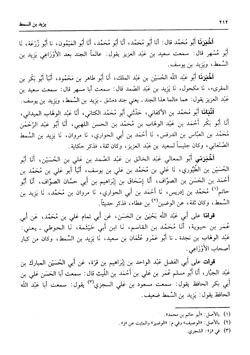 أخبرنا أبو محمد قال أنا أبو محمد أنا أبو محمد أنا أبو الميمون نا أبو زرعة نا أبو مسهرقال سمعت سعيد بن عبد العزيز يقول عالما الجند بعد الأوزاعي يزيد بن السمط ويزيد بن يوسف أخبرنا أبو عبد الله الحسين بن عبد الملك أنا أبو طاهر بن محمود أنبأ أبو بكر بن المقرئ نا مكحول نا يزيد بن عبد الصمد قال سمعت أبا مسهر قال سمعت سعيد بن عبد العزيز يقول هما عالما هذا الجند يعني جند دمشق يزيد بن السمط ويزيد بن يوسف أنبأنا أبو محمد بن الأكفاني حدثني أبو محمد الكتاني أنا عبد الوهاب الميداني أنا أبو بكر أحمد بن عبد الوهاب بن محمد بن الحسن اللهبي أنا أبو عبد الرحمن محمد بن العباس بن الدرفس نا أحمد بن أبي الحواري نا مروان نا يزيد بن السمط الصنعاني وكان جليسا لسعيد بن عبد العزيز وكان ثقة فذكر حكاية أخبرني أبو المعالي عبد الخالق بن عبد الصمد بن علي بن الحسين أنا أبو الحسين بن الطيوري نا علي بن محمد بن علي بن يوسف أنبأ أبو علي بن محمد بن أحمد بن الحسن بن الصواف أنا إسحاق بن إبراهيم بن أبي حسان الصواف أنا أبو حاتم (1) محمد بن إدريس نا أحمد بن أبي الحواري نا مروان بن محمد نا يزيد بن السمط وكان ثقة عن الوضين (2) بن عطاء فذكر حديثا قرأنا على أبي عبد الله يحيى بن الحسن عن أبي تمام علي بن محمد عن أبي عمربن حيوية أنا محمد بن القاسم نا ابن أبي خيثمة نا الحوطي يعني عبد الوهاب بن نجدة نا أبو عمرو عثمان بن سعيد نا يزيد بن السمط وكان من كبار أصحاب الأوزاعي قرأت على أبي الفضل عبد الواحد بن إبراهيم بن قرة عن أبي الحسين المبارك بن عبد الجبار أنا أبو مسلم عمر بن علي بن أحمد بن الليث قال سمعت أبا الحسن علي بن أبي بكر الحافظ يقول سمعت مسعود بن علي السجزي (3) يقول سمعت أبا عبد الله الحافظ يقول يزيد بن السمط ضعيف