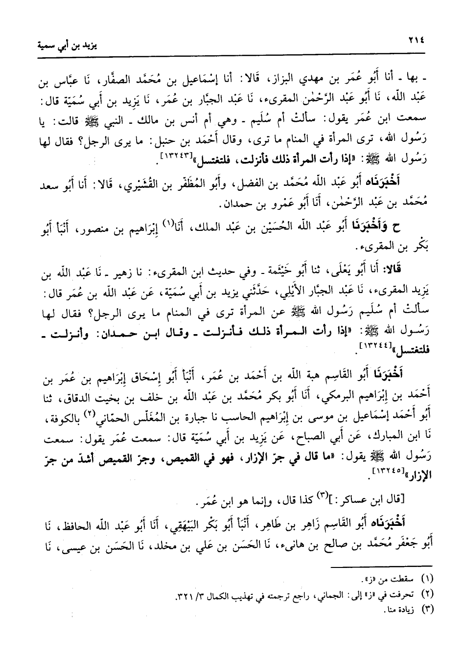 بها أنا أبو عمر بن مهدي البزاز قالا أنا إسماعيل بن محمد الصفار نا عباس بن عبد الله نا أبو عبد الرحمن المقرئ نا عبد الجبار بن عمر نا يزيد بن أبي سمية قال سمعت ابن عمر يقول سألت أم سليم وهي أم أنس بن مالك النبي (صلى الله عليه وسلم) قالت يا رسول الله ترى المرأة في المنام ما ترى وقال أحمد بن حنبل ما يرى الرجل فقال لها رسول الله (صلى الله عليه وسلم) إذا رأت المرأة ذلك فأنزلت فلتغتسل أخبرناه أبو عبد الله محمد بن الفضل وأبو المظفر بن القشيري قالا أنا أبو سعد محمد بن عبد الرحمن أنا أبو عمرو بن حمدان ح وأخبرنا أبو عبد الله الحسين بن عبد الملك أنا إبراهيم (1) بن منصور أنبأ أبو بكربن المقرئ قالا أنا أبو يعلى ثنا أبو خيثمة وفي حديث ابن المقرئ نا زهير نا عبد الله بن يزيد المقرئ نا عبد الجبار الأيلي حدثني يزيد بن أبي سمية عن عبد الله بن عمر قال سألت أم سليم رسول الله (صلى الله عليه وسلم) عن المرأة ترى في المنام ما يرى الرجل فقال لها رسول الله (صلى الله عليه وسلم) إذا رأت المرأة ذلك فأنزلت وقال ابن حمدان وأنزلت فلتغتسل أخبرنا أبو القاسم هبة الله بن أحمد بن عمر أنبأ أبو إسحاق إبراهيم بن عمر بن أحمد بن إبراهيم البرمكي أنا أبو بكر محمد بن عبد الله بن خلف بن بخيت الدقاق ثنا أبو أحمد إسماعيل بن موسى بن إبراهيم الحاسب نا جبارة بن المغلس الحماني (2) بالكوفة نا ابن المبارك عن أبي الصباح عن يزيد بن أبي سمية قال سمعت عمر يقول سمعت رسول الله (صلى الله عليه وسلم) يقول ما قال في جر الإزار فهو في القميص وجر القميص أشد من جر الإزار قال ابن عساكر (3) كذا قال وإنما هو ابن عمر أخبرناه أبو القاسم زاهر بن طاهر أنبأ أبو بكر البيهقي أنا أبو عبد الله الحافظ نا أبو جعفر محمد بن صالح بن هانئ نا الحسن بن علي بن مخلد نا الحسن بن عيسى نا
