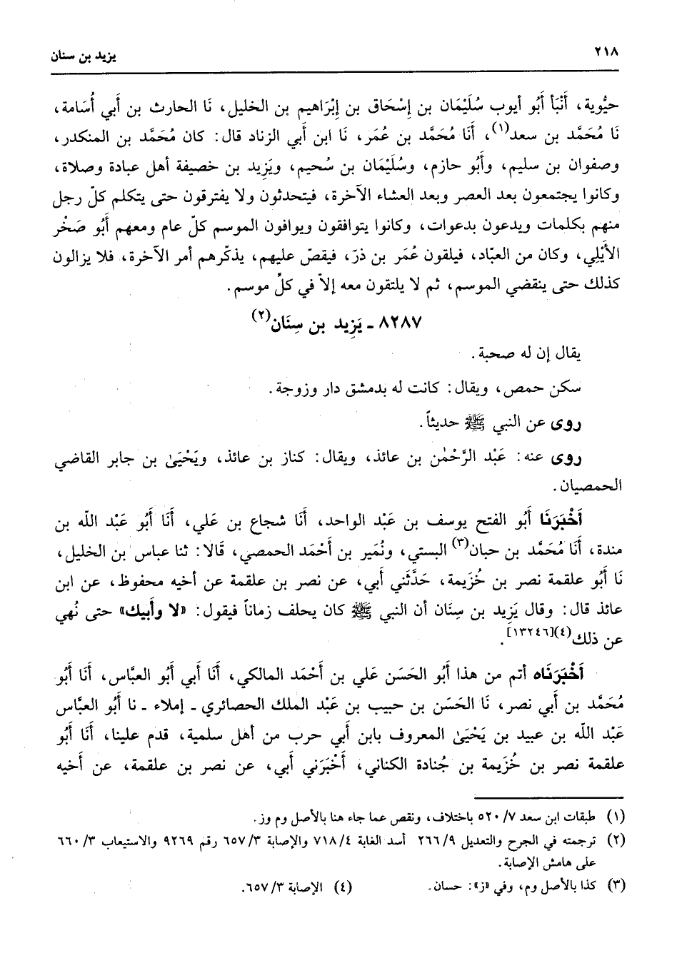 8287 - يزيد بن سنان (2) يقال إن له صحبة سكن حمص ويقال كانت له بدمشق دار وزوجة روى عن النبي (صلى الله عليه وسلم) حديثا روى عنه عبد الرحمن بن عائذ ويقال كناز بن عائذ ويحيى بن جابر القاضي الحمصيان أخبرنا أبو الفتح يوسف بن عبد الواحد أنا شجاع بن علي أنا أبو عبد الله بن مندة أنا محمد بن حبان (3) البستي ونمير بن أحمد الحمصي قالا ثنا عباس بن الخليل نا أبو علقمة نصر بن خزيمة حدثني أبي عن نصر بن علقمة عن أخيه محفوظ عن ابن عائذ قال وقال يزيد بن سنان أن النبي (صلى الله عليه وسلم) كان يحلف زمانا فيقول لا وأبيك حتى نهي عن ذلك (4) أخبرناه أتم من هذا أبو الحسن علي بن أحمد المالكي أنا أبي أبو العباس أنا أبو محمد بن أبي نصر نا الحسن بن حبيب بن عبد الملك الحصائري إملاء نا أبو العباس عبد الله بن عبيد بن يحيى المعروف بابن أبي حرب من أهل سلمية قدم علينا أنا أبو علقمة نصر بن خزيمة بن جنادة الكناني أخبرني أبي عن نصر بن علقمة عن أخيه
