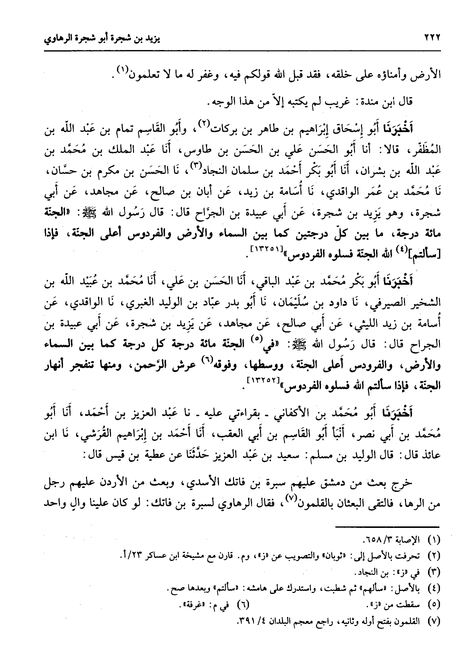 الأرض وأمناؤه على خلقه فقد قبل الله قولكم فيه وغفر له ما لا تعلمون (1) قال ابن مندة غريب لم يكتبه إلا من هذا الوجه أخبرنا أبو إسحاق إبراهيم بن طاهر بن بركات (2) وأبو القاسم تمام بن عبد الله بن المظفر قالا أنا أبو الحسن علي بن الحسن بن طاوس أنا عبد الملك بن محمد بن عبد الله بن بشران أنا أبو بكر أحمد بن سلمان النجاد (3) نا الحسن بن مكرم بن حسان نا محمد بن عمر الواقدي نا أسامة بن زيد عن أبان بن صالح عن مجاهد عن أبي شجرة وهو يزيد بن شجرة عن أبي عبيدة بن الجراح قال قال رسول الله (صلى الله عليه وسلم) الجنة مائة درجة ما بين كل درجتين كما بين السماء والأرض والفردوس أعلى الجنة فإذا سألتم (4) الله الجنة فسلوه الفردوس أخبرنا أبو بكر محمد بن عبد الباقي أنا الحسن بن علي أنا محمد بن عبيد الله بن الشخير الصيرفي نا داود بن سليمان نا أبو بدر عباد بن الوليد الغبري نا الواقدي عن أسامة بن زيد الليثي عن أبي صالح عن مجاهد عن يزيد بن شجرة عن أبي عبيدة بن الجراح قال قال رسول الله (صلى الله عليه وسلم) في (5) الجنة مائة درجة كل درجة كما بين السماء والأرض والفردوس أعلى الجنة ووسطها وفوقه (6) عرش الرحمن ومنها تنفجر أنهار الجنة فإذا سألتم الله فسلوه الفردوس أخبرنا أبو محمد بن الأكفاني بقراءتي عليه نا عبد العزيز بن أحمد أنا أبو محمد بن أبي نصر أنبأ أبو القاسم بن أبي العقب أنا أحمد بن إبراهيم القرشي نا ابن عائذ قال قال الوليد بن مسلم سعيد بن عبد العزيز حدثنا عن عطية بن قيس قال خرج بعث من دمشق عليهم سبرة بن فاتك الأسدي وبعث من الأردن عليهم رجل من الرها فالتقى البعثان بالقلمون (7) فقال الرهاوي لسبرة بن فاتك لو كان علينا وال واحد