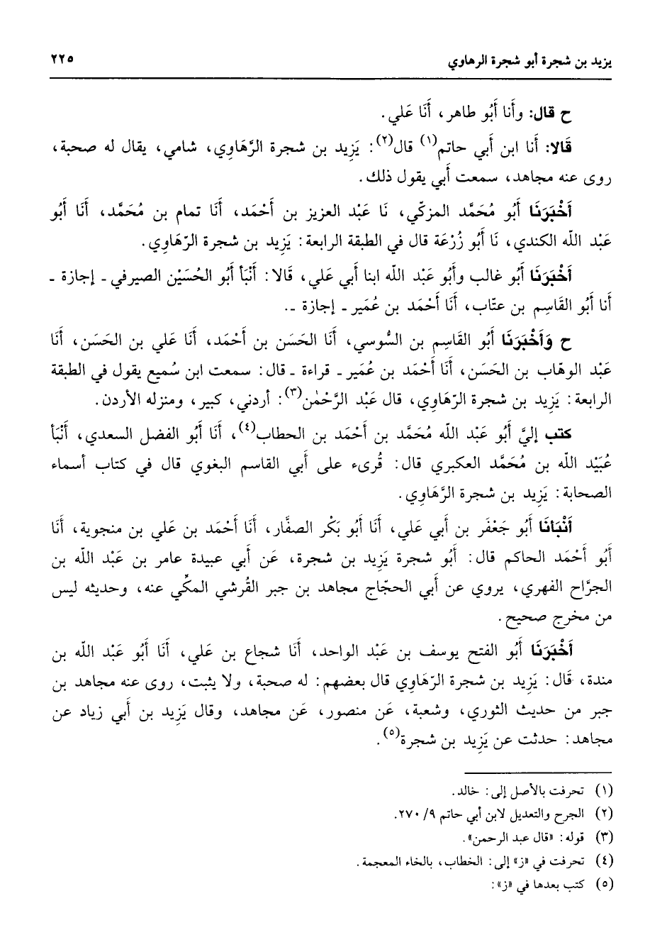 ح قال وأنا أبو طاهر أنا علي قالا أنا ابن أبي حاتم (1) قال (2) يزيد بن شجرة الرهاوي شامي يقال له صحبة روى عنه مجاهد سمعت أبي يقول ذلك أخبرنا أبو محمد المزكي نا عبد العزيز بن أحمد أنا تمام بن محمد أنا أبو عبد الله الكندي نا أبو زرعة قال في الطبقة الرابعة يزيد بن شجرة الرهاوي أخبرنا أبو غالب وأبو عبد الله ابنا أبي علي قالا أنبأ أبو الحسين الصيرفي إجازة أنا أبو القاسم بن عتاب أنا أحمد بن عمير إجازة ح وأخبرنا أبو القاسم بن السوسي أنا الحسن بن أحمد أنا علي بن الحسن أنا عبد الوهاب بن الحسن أنا أحمد بن عمير قراءة قال سمعت ابن سميع يقول في الطبقة الرابعة يزيد بن شجرة الرهاوي قال عبد الرحمن (3) أردني كبير ومنزله الأردن كتب إلي أبو عبد الله محمد بن أحمد بن الحطاب (4) أنا أبو الفضل السعدي أنبأ عبيد الله بن محمد العكبري قال قرئ على أبي القاسم البغوي قال في كتاب أسماء الصحابة يزيد بن شجرة الرهاوي أنبأنا أبو جعفر بن أبي علي أنا أبو بكر الصفار أنا أحمد بن علي بن منجوية أنا أبو أحمد الحاكم قال أبو شجرة يزيد بن شجرة عن أبي عبيدة عامر بن عبد الله بن الجراح الفهري يروي عن أبي الحجاج مجاهد بن جبر القرشي المكي عنه وحديثه ليس من مخرج صحيح أخبرنا أبو الفتح يوسف بن عبد الواحد أنا شجاع بن علي أنا أبو عبد الله بن مندة قال يزيد بن شجرة الرهاوي قال بعضهم له صحبة ولا يثبت روى عنه مجاهد بن جبرمن حديث الثوري وشعبة عن منصور عن مجاهد وقال يزيد بن أبي زياد عن مجاهد حدثت عن يزيد بن شجرة (5)