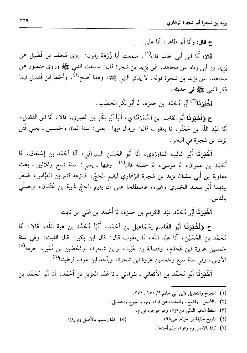 ح قال وأنا أبو طاهر أنا علي قالا أنا ابن أبي حاتم قال (1) سمعت أبا زرعة يقول روى محمد بن فضيل عن يزيد بن أبي زياد عن مجاهد عن يزيد بن شجرة قال سمعت النبي (صلى الله عليه وسلم) وروى منصور عن مجاهد عن يزيد بن شجرة قوله لا يذكر النبي (صلى الله عليه وسلم) وهذا أصح (2) وأخطأ ابن فضيل فيما ذكر النبي (صلى الله عليه وسلم) في حديثه أخبرنا أبو محمد بن حمزة نا أبو بكر الخطيب ح وأخبرنا أبو القاسم بن السمرقندي أنبأ أبو بكر بن الطبري قالا أنا ابن الفضل أنا عبد الله بن جعفر نا يعقوب قال ويقال فيها يعني سنة ثمان وخمسين يعني قتل يزيد بن شجرة في البحر أخبرنا أبو غالب الماوردي أنا أبو الحسن السيرافي أنا أحمد بن إسحاق نا أحمد بن عمران نا موسى نا خليفة قال (4) وفيها يعني سنة تسع وثلاثين بعث معاوية بن أبي سفيان يزيد بن شجرة الرهاوي ليقيم الحج فنازعه قثم بن العباس فسفر بينهما أبو سعيد الخدري وغيره فاصطلحا على أن يقيم الحج شيبة بن عثمان ويصلي بالناس أخبرنا أبو محمد عبد الكريم بن حمزة نا أحمد بن علي بن ثابت ح وأخبرنا أبو القاسم إسماعيل بن أحمد أنبأ محمد بن هبة الله قالا أنا محمد بن الحسين أنا عبد الله نا يعقوب قال قال ابن بكير قال الليث وفي سنة خمسين غزوة ابن قحذم وفضالة بن عبيد وابن شجرة والحصين بن نمير حرمه (5) الأولى وفي سنة سبع وخمسين غزوة ابن شجرة ويأخذ ابن عوف قرطيشا (6) أخبرنا أبو محمد بن الأكفاني بقراءتي نا عبد العزيز بن أحمد أنا أبو محمد بن