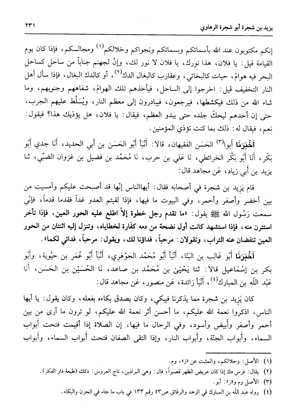 إنكم مكتوبون عند الله بأسمائكم وبسماتكم ونجواكم وخلالكم (1) ومجالسكم فإذا كان يوم القيامة قيل يا فلان هذا نورك يا فلان لا نور لك وإن لجهنم جنابا من ساحل كساحل البحر فيه هوام حيات كالبخاتي وعقارب كالبغال الدك (2) أو كالدك البغال فإذا سأل أهل النار التخفيف قيل اخرجوا إلى الساحل فيأخذهم تلك الهوام شفاههم وجنوبهم وما شاء الله من ذلك فيكشطها فيرجعون فيبادرون إلى معظم النار ويسلط عليهم الجرب حتى إن أحدهم ليحك جلده حتى يبدو العظم فيقال يا فلان هل يؤذيك هذا فيقول نعم فيقال له ذلك بما كنت تؤذي المؤمنين أخبرنا أبو (3) الحسن الفقيهان قالا أنبأ أبو الحسن بن أبي الحديد أنا جدي أبو بكر أنا أبو بكر الخرائطي نا علي بن حرب نا محمد بن فضيل بن غزوان الضبي ثنا يزيد بن أبي زياد عن مجاهد قال قام يزيد بن شجرة في أصحابه فقال أيها الناس إنها قد اصبحت عليكم وأمسيت من بين أخضر وأصفر وأحمر وفي البيوت ما فيها فإذا لقيتم العدو غدا فقدما قدما فإني سمعت رسول الله (صلى الله عليه وسلم) يقول ما تقدم رجل خطوة إلا اطلع عليه الحور العين فإذا تأخروا استترن منه فإذا استشهد كانت أول نضحة من دمه كفارة لخطاياه وتنزل إليه اثنتان من الحور العين تنقضان عنه التراب وتقولان مرحبا فداؤنا لك ويقول مرحبا فدائي لكما أخبرنا أبو غالب بن البنا أنبأ أبو محمد الجوهري أنبأ أبو عمر بن حيوية وأبو بكربن إسماعيل قالا ثنا يحيى بن محمد بن صاعد نا الحسين بن الحسن أنا عبد الله بن المبارك (4) أنبأ زائدة عن منصور عن مجاهد قال كان يزيد بن شجرة مما يذكرنا فيبكي وكان يصدق بكاءه بفعله وكان يقول يا أيها الناس اذكروا نعمة الله عليكم ما أحسن أثر نعمة الله عليكم لو ترون ما ارى من بين أحمر وأصفر وأبيض وأسود وفي الرحال ما فيها إن الصلاة إذا أقيمت فتحت أبواب السماء وأبواب الجنة وأبواب النار وإذا التقى الصفان فتحت أبواب السماء وأبواب