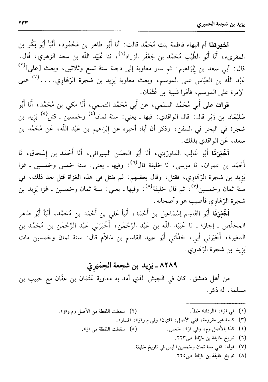 أخبرتنا أم البهاء فاطمة بنت محمد قالت أنا أبو طاهر بن محمود أنبأ أبو بكر بن المقرئ أنا أبو الطيب محمد بن جعفر الزراد (1) ثنا عبيد الله بن سعد الزهري قال قال أبي سعد بن إبراهيم ثم سار معاوية إلى دجلة سنة تسع وثلاثين وبعث علي (2) عبد الله بن العباس على الموسم وبعث معاوية يزيد بن شجرة الرهاوي (3) على الإمرة على الموسم فأمرا شيبة بن عثمان قرأت على أبي محمد السلمي عن أبي محمد التميمي أنا مكي بن محمد أنا أبو سليمان بن زبر قال قال الواقدي فيها يعني سنة ثمان (4) وخمسين قتل (5) يزيد بن شجرة في البحر في السفن وذكر أن أباه أخبره عن إبراهيم بن عبد الله عن محمد بن سعد عن الواقدي بذلك أخبرنا أبو غالب الماوردي أنا أبو الحسن السيرافي أنا أحمد بن إسحاق نا أحمد بن عمران نا موسى نا خليفة قال (6) وفيها يعني سنة خمس وخمسين غزا يزيد بن شجرة الرهاوي فقتل وقال بعضهم لم يقتل في هذه الغزاة قتل بعد ذلك في سنة ثمان وخمسين (7) ثم قال خليفة (8) وفيها يعني سنة ثمان وخمسين غزا يزيد بن شجرة الرهاوي فأصيب هو وأصحابه أخبرنا أبو القاسم اسماعيل بن أحمد أنبأ علي بن أحمد بن محمد أنبأ أبو طاهر المخلص إجازة نا عبيد الله بن عبد الرحمن أخبرني عبد الرحمن بن محمد بن المغيرة أخبرني أبي حدثني أبو عبيد القاسم بن سلام قال سنة ثمان وخمسين مات يزيد بن شجرة الرهاوي