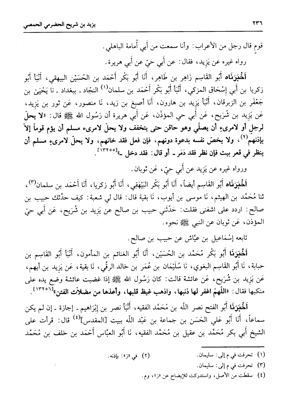 قوم قال رجل من الأعراب وأنا سمعت من أبي أمامة الباهلي رواه غيره عن يزيد فقال عن أبي حي عن أبي هريرة أخبرناه أبو القاسم زاهر بن طاهر أنا أبو بكر أحمد بن الحسين البيهقي أنبأ أبو زكريا بن أبي إسحاق المزكي أنبأ أبو بكر احمد بن سلمان (1) النجاد ببغداد نا يحيى بن جعفر بن الزبرقان أنبأ يزيد بن هارون أنا أصبغ بن زيد نا منصور عن ثور بن يزيد عن يزيد بن شريح عن أبي حي المؤذن عن أبي هريرة أن رسول الله (صلى الله عليه وسلم) قال لا يحل لرجل أو لامرئ أن يصلي وهو حاقن حتى يتخفف ولا يحل لامرئ مسلم أن يؤم قوما إلا بإذنهم (2) ولا يخص نفسه بدعوة دونهم فإن فعل فقد خانهم ولا يحل لامرئ مسلم أن ينظر في قعر بيت فإن نظر فقد دمر أو قال فقد دخل ورواه غيره عن يزيد عن أبي حي عن ثوبان أخبرناه أبو القاسم أيضا أنا أبو بكر البيهقي أنا أبو زكريا أنا أحمد بن سلمان (3) ثنا محمد بن الهيثم نا موسى بن أيوب نا بقية قال قال لي شعبة كيف حدثك حبيب بن صالح اردد على اشفني فقلت حدثني حبيب بن صالح عن يزيد بن شريح عن أبي حي المؤذن عن ثوبان عن النبي (صلى الله عليه وسلم) نحوه تابعه إسماعيل بن عياش عن حبيب بن صالح أخبرنا أبو بكر محمد بن الحسين أنا أبو الغنائم بن المأمون أنبأ أبو القاسم بن حبابة نا أبو القاسم البغوي نا سليمان بن عمر بن خالد الرقي نا بقية عن يزيد بن أيهم عن يزيد بن شريح عن عائشة قالت كان رسول الله (صلى الله عليه وسلم) إذا غضبت عائشة وضع يده على منكبها فقال اللهم اغفر لها ذنبها واذهب غيظ قلبها وأعذها من مضلات الفتن أخبرنا أبو الفتح نصر الله بن محمد الفقيه أنبأ نصر بن إبراهيم إجازة إن لم يكن سماعا أنا أبو علي الحسن بن جماعة بن عبد الله ببيت المقدس (4) قال قرأت على الشيخ أبي بكر محمد بن عقيل بن محمد الفقيه نا أبو العباس أحمد بن خلف بن محمد
