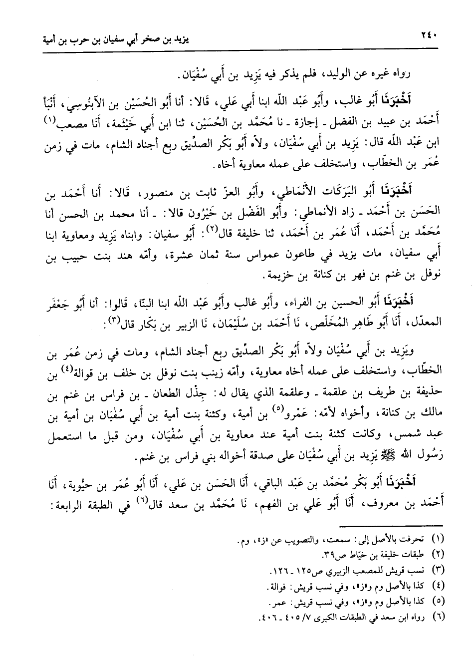 رواه غيره عن الوليد فلم يذكر فيه يزيد بن أبي سفيان أخبرنا أبو غالب وأبو عبد الله ابنا أبي علي قالا أنا أبو الحسين بن الآبنوسي أنبأ أحمد بن عبيد بن الفضل إجازة نا محمد بن الحسين ثنا ابن أبي خيثمة أنا مصعب (1) ابن عبد الله قال يزيد بن أبي سفيان ولاه أبو بكر الصديق ربع أجناد الشام مات في زمن عمربن الخطاب واستخلف على عمله معاوية أخاه أخبرنا أبو البركات الأنماطي وابو العز ثابت بن منصور قالا أنا أحمد بن الحسن بن احمد زاد الأنماطي وأبو الفضل بن خيرون قالا أنا محمد بن الحسن أنا محمد بن أحمد أنا عمر بن أحمد ثنا خليفة قال (2) أبو سفيان وابناه يزيد ومعاوية ابنا أبي سفيان مات يزيد في طاعون عمواس سنة ثمان عشرة وأمه هند بنت حبيب بن نوفل بن غنم بن فهر بن كنانة بن خزيمة أخبرنا أبو الحسين بن الفراء وأبو غالب وأبو عبد الله ابنا البنا قالوا أنا أبو جعفر المعدل أنا أبو طاهر المخلص نا أحمد بن سليمان نا الزبير بن بكار قال (3) ويزيد بن أبي سفيان ولاه أبو بكر الصديق ربع أجناد الشام ومات في زمن عمر بن الخطاب واستخلف على عمله أخاه معاوية وأمه زينب بنت نوفل بن خلف بن قوالة (4) بن حذيفة بن طريف بن علقمة وعلقمة الذي يقال له جذل الطعان بن فراس بن غنم بن مالك بن كنانة وأخوان لأمه عمرو (5) بن أمية وكثنة بنت أمية بن أبي سفيان بن أمية بن عبد شمس وكانت كثنة بنت أمية عند معاوية بن أبي سفيان ومن قبل ما استعمل رسول الله (صلى الله عليه وسلم) يزيد بن أبي سفيان على صدقة أخواله بني فراس بن غنم أخبرنا أبو بكر محمد بن عبد الباقي أنا الحسن بن علي أنا أبو عمر بن حيوية أنا أحمد بن معروف أنا أبو علي بن الفهم نا محمد بن سعد قال (6) في الطبقة الرابعة