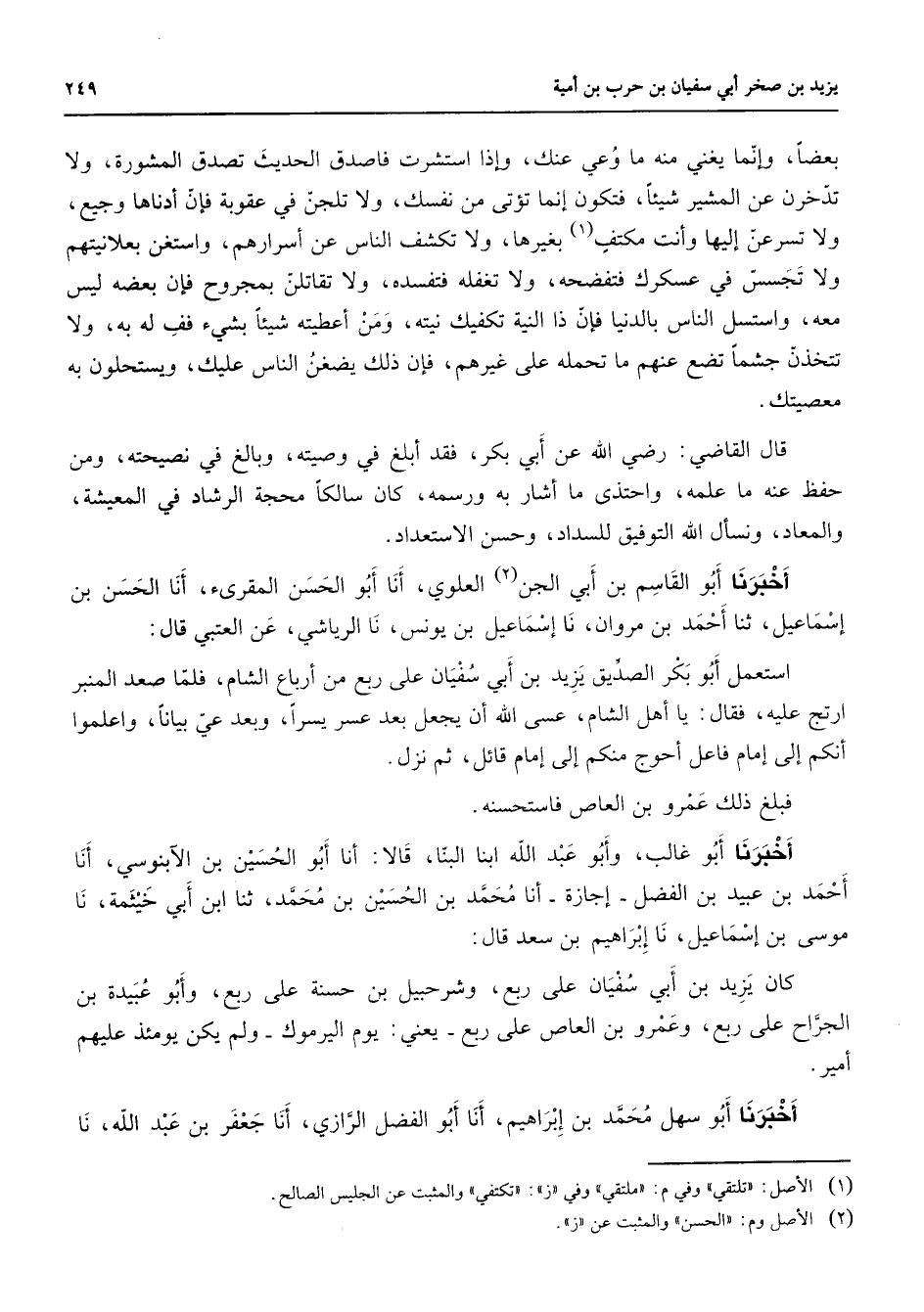 بعضا وإنما يغني منه ما وعي عنك وإذا استشرت فاصدق الحديث تصدق المشورة ولا تدخرن عن المشير شيئا فتكون إنما تؤتى من نفسك ولا تلجن في عقوبة فإن أدناها وجيع ولا تسرعن إليها وأنت مكتف (1) بغيرها ولا تكشف الناس عن أسرارهم واستغن بعلانيتهم ولا تجسس في عسكرك فتفضحه ولا تغفله فتفسده ولا تقاتلن بمجروح فإن بعضه ليس معه واستسل الناس بالدنيا فإن ذا النية تكفيك نيته ومن أعطيته شيئا بشئ فف له به ولا تتخذن جشما تضع عنهم ما تحمله على غيرهم فإن ذلك يضغن الناس عليك ويستحلون به معصيتك قال القاضي B أبي بكر فقد أبلغ في وصيته وبالغ في نصيحته ومن حفظ عنه ما علمه واحتذى ما أشار به ورسمه كان سالكا محجة الرشاد في المعيشة والمعاد ونسأل الله التوفيق للسداد وحسن الاستعداد أخبرنا أبو القاسم بن أبي الجن (2) العلوي أنا أبو الحسن المقرئ أنا الحسن بن إسماعيل ثنا أحمد بن مروان نا إسماعيل بن يونس نا الرياشي عن العتبي قال استعمل أبو بكر الصديق يزيد بن أبي سفيان على ربع من أرباع الشام فلما صعد المنبر ارتج عليه فقال يا أهل الشام عسى الله أن يجعل بعد عسر يسرا وبعد عي بيانا واعلموا أنكم إلى إمام فاعل أحوج منكم إلى إمام قائل ثم نزل فبلغ ذلك عمرو بن العاص فاستحسنه أخبرنا أبو غالب وأبو عبد الله ابنا البنا قالا أنا أبو الحسين بن الآبنوسي أنا أحمد بن عبيد بن الفضل إجازة أنا محمد بن الحسين بن محمد ثنا ابن أبي خيثمة نا موسى بن إسماعيل نا إبراهيم بن سعد قال كان يزيد بن أبي سفيان على ربع وشرحبيل بن حسنة على ربع وأبو عبيدة بن الجراح على ربع وعمرو بن العاص على ربع يعني يوم اليرموك ولم يكن يومئذ عليهم أمير أخبرنا أبو سهل محمد بن إبراهيم أنا أبو الفضل الرازي أنا جعفر بن عبد الله نا