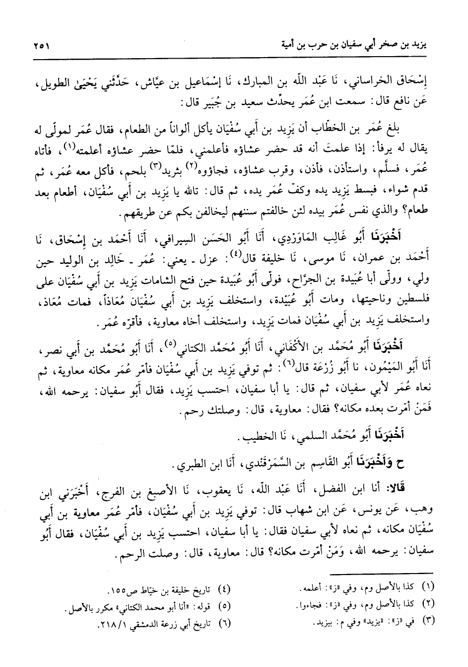 إسحاق الخراساني نا عبد الله بن المبارك نا إسماعيل بن عياش حدثني يحيى الطويل عن نافع قال سمعت ابن عمر يحدث سعيد بن جبير قال بلغ عمر بن الخطاب أن يزيد بن أبي سفيان يأكل ألوانا من الطعام فقال عمر لمولى له يقال له يرفأ إذا علمت أنه قد حضر عشاؤه فأعلمني فلما حضر عشاؤه أعلمته (1) فأتاه عمر فسلم واستأذن فأذن وقرب عشاؤه فجاؤوه (2) بثريد بلحم (3) فأكل معه عمر ثم قدم شواء فبسط يزيد يده وكف عمر يده ثم قال تالله يا يزيد بن أبي سفيان أطعام بعد طعام والذي نفس عمر بيده لئن خالفتم سننهم ليخالفن بكم عن طريقهم أخبرنا أبو غالب الماوردي أنا أبو الحسن السيرافي أنا أحمد بن إسحاق نا أحمد بن مران نا موسى نا خليفة قال (4) عزل يعني عمر خالد بن الوليد حين ولي وولى أبا عبيدة بن الجراح فولى أبو عبيدة حين فتح الشامات يزيد بن أبي سفيان على فلسطين وناحيتها ومات أبو عبيدة واستخلف يزيد بن أبي سفيان معاذا فمات معاذ واستخلف يزيد بن أبي سفيان فمات يزيد واستخلف أخاه معاوية فأقره عمر أخبرنا أبو محمد بن الأكفاني أنا أبو محمد الكتاني (5) أنا أبو محمد بن أبي نصر أنا أبو الميمون نا أبو زرعة قال (6) ثم توفي يزيد بن أبي سفيان فأمر عمر مكانه معاوية ثم نعاه عمر لأبي سفيان ثم قال يا أبا اسفيان احتسب يزيد فقال أبو سفيان يرحمه الله فمن أمرت بعده مكانه فقال معاوية قال وصلتك رحم أخبرنا أبو محمد السلم نا الخطيب ح وأخبرنا أبو القاسم بن السمرقندي أنا ابن الطبري قالا أنا ابن الفضل أنا عبد الله نا يعقوب نا الأصبغ بن الفرج أخبرني ابن وهب عن يونس عن ابن شهاب قال توفي يزيد بن أبي سفيان فأمر عمر معاوية بن أبي سفيان مكانه ثم نعاه لأبي سفيان فقال يا أبا سفيان احتسب يزيد بن أبي سفيان فقال أبو سفيان يرحمه الله ومن أمرت مكانه قال معاوية قال وصلت الرحم