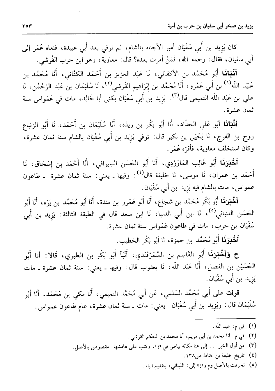 كان يزيد بن أبي سفيان أمير الأجناد بالشام ثم توفي بعد أبي عبيدة فنعاه عمر إلى أبي سفيان فقال رحمه الله فمن أمرت بعده قال معاوية وهو ابن حرب القرشي أنبأنا أبو محمد بن الأكفاني نا عبد العزيز بن أحمد الكتاني أنا محمد بن عبيد الله (1) بن أبي عمرو أنا محمد بن إبراهيم القرشي (2) نا سليمان بن عبد الرحمن نا علي بن عبد الله التميمي قال (3) يزيد بن أبي سفيان يكنى أبا خالد مات في عمواس سنة ثمان عشرة أنبأنا أبو علي الحداد أنا أبو بكر بن زبذة أنا سليمان بن أحمد نا أبو الزنباع روح بن الفرج نا يحيى بن بكير قال توفي يزيد بن أبي سفيان بالشام سنة ثمان عشرة وكان استخلف معاوية فأقره عمر أخبرنا أبو غالب الماوردي أنا أبو الحسن السيرافي أنا أحمد بن إسحاق نا أحمد بن عمران نا موسى نا خليفة قال (4) وفيها يعني سنة ثمان عشرة طاعون عمواس مات بالشام فيه يزيد بن أبي سفيان أخبرنا أبو بكر محمد بن شجاع أنا أبو عمرو بن مندة أنا أبو محمد بن يوه أنا أبو الحسن اللنباني (5) نا ابن أبي الدنيا نا ابن سعد قال في الطبقة الثالثة يزيد بن أبي سفيان بن حرب مات في طاعون عمواس سنة ثمان عشرة أخبرنا أبو محمد بن حمزة نا أبو بكر الخطيب ح وأخبرنا أبو القاسم بن السمرقندي أنبأ أبو بكر بن الطبري قالا أنا أبو الحسين بن الفضل أنا عبد الله نا يعقوب قال وفيها يعني سنة ثمان عشرة مات يزيد بن أبي سفيان قرأت على أبي محمد السلمي عن أبي محمد التميمي أنا مكي بن محمد أنا أبو سليمان قال ويزيد بن أبي سفيان يعني مات سنة ثمان عشرة عام طاعون عمواس