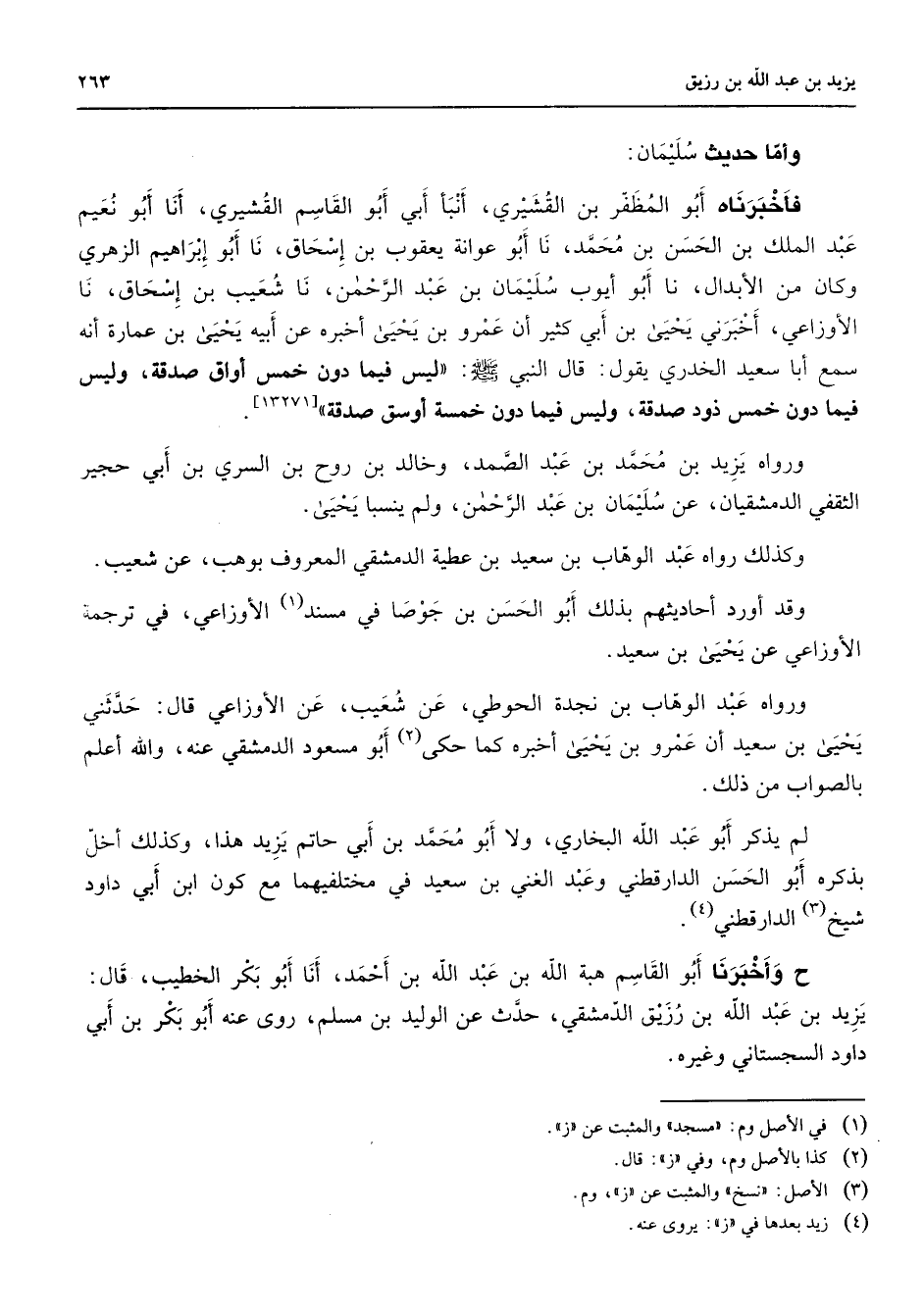 وأما حديث سليمان فأخبرناه أبو المظفر بن القشيري أنبأ أبي أبو القاسم القشيري أنا أبو نعيم عبد الملك بن الحسن بن محمد نا أبو عوانة يعقوب بن إسحاق نا أبو إبراهيم الزهري وكان من الأبدال نا أبو أيوب سليمان بن عبد الرحمن نا شعيب بن إسحاق نا الأوزاعي أخبرني يحيى بن أبي كثير أن عمرو بن يحيى أخبره عن أبيه يحيى بن عمارة أنه سمع أبا سعيد الخدري يقول قال النبي (صلى الله عليه وسلم) ليس فيما دون خمس أواق صدقة وليس فيما دون خمس ذود صدقة وليس فيما دون خمسة أوسق صدقة ورواه يزيد بن محمد بن عبد الصمد وخالد بن روح بن السري بن أبي حجير الثقفي الدمشقيان عن سليمان بن عبد الرحمن ولم ينسبا يحيى وكذلك رواه عبد الوهاب بن سعيد بن عطية الدمشقي المعروف بوهب عن شعيب وقد أرد أحاديثهم بذلك أبو الحسن بن جوصا في مسند (1) الأوزاعي في ترجمة الأوزاعي عن يحيى بن سعيد ورواه عبد الوهاب بن نجدة الحوطي عن شعيب عن الأوزاعي قال حدثني يحيى بن سعيد أن عمرو بن يحيى أخبره كما حكى (2) أبو مسعود الدمشقي عنه والله أعلم بالصواب من ذلك لم يذكر أبو عبد الله البخاري ولا أبو محمد بن أبي حاتم يزيد هذا وكذلك أخل بذكره أبو الحسن الدارقطني وعبد الغني بن سعيد في مختلفيهما مع كون ابن أبي داود شيخ (3) الدارقطني (4) ح وأخبرنا أبو القاسم هبة الله بن عبد الله بن أحمد أنا أبو بكر الخطيب قال يزيد بن عبد الله بن رزيق الدمشقي حدث عن الوليد بن مسلم روى عنه أبو بكر بن أبي داود السجستاني وغيره