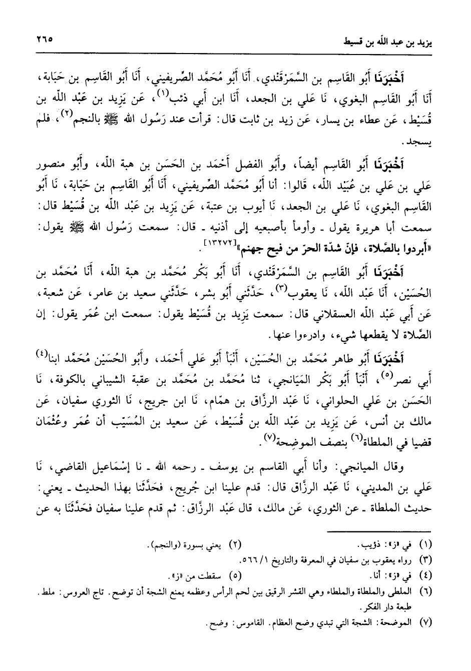 أخبرنا أبو القاسم بن السمرقندي أنا أبو محمد الصريفيني أنا أبو القاسم بن حبابة أنا أبو القاسم البغوي نا علي بن الجعد أنا ابن أبي ذئب (1) عن يزيد بن عبد الله بن قسيط عن عطاء بن يسار عن زيد بن ثابت قال قرأت عند رسول الله (صلى الله عليه وسلم) بالنجم (2) فلم يسجد أخبرنا أبو القاسم أيضا وأبو الفضل أحمد بن الحسن بن هبة الله وأبو منصور علي بن علي بن عبيد الله قالوا أنا أبو محمد الصريفيني أنا أبو القاسم بن حبابة نا أبو القاسم البغوي نا علي بن الجعد نا أيوب بن عتبة عن يزيد بن عبد الله بن قسيط قال سمعت أبا هريرة يقول وأومأ بأصبعيه إلى أذنيه قال سمعت رسول الله (صلى الله عليه وسلم) يقول أبردوا بالصلاة فإن شدة الحر من فيح جهنم أخبرنا أبو القاسم بن السمرقندي أنا أبو بكر محمد بن هبة الله أنا محمد بن الحسين أنا عبد الله نا يعقوب (3) حدثني أبو بشر حدثني سعيد بن عامر عن شعبة عن أبي عبد الله العسقلاني قال سمعت يزيد بن قسيط يقول سمعت ابن عمر يقول إن الصلاة لا يقطعها شئ وادرءوا عنها أخبرنا أبو طاهر محمد بن الحسين أنبأ أبو علي أحمد وأبو الحسين محمد ابنا (4) أبي نصر (5) أنبأ أبو بكر الميانجي ثنا محمد بن محمد بن عقبة الشيباني بالكوفة نا الحسن بن علي الحلواني نا عبد الرزاق بن همام نا ابن جريج نا الثوري سفيان عن مالك بن أنس عن يزيد بن عبد الله بن قسيط عن سعيد بن المسيب أن عمر وعثمان قضيا في الملطاة (6) بنصف الموضحة (7) وقال الميانجي وأنا أبي القاسم بن يوسف رحمه الله نا إسماعيل القاضي نا علي بن المديني نا عبد الرزاق قال قدم علينا ابن جريج فحدثنا بهذا الحديث يعني حديث الملطاة عن الثوري عن مالك قال عبد الرزاق ثم قدم علينا سفيان فحدثنا به عن