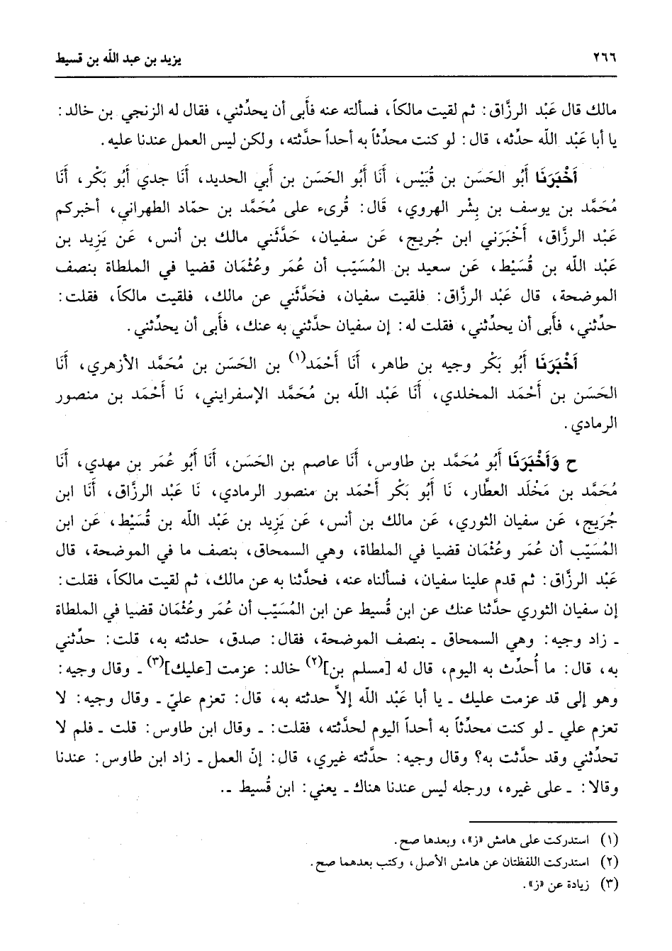 مالك قال عبد الرزاق ثم لقيت مالكا فسألته عنه فأبى أن يحدثني فقال له الزنجي بن خالد يا أبا عبد الله حدثه قال لو كنت محدثا به أحدا حدثته ولكن ليس العمل عندنا عليه أخبرنا أبو الحسن بن قبيس أنا أبو الحسن بن أبي الحديد أنا جدي أبو بكر أنا محمد بن يوسف بن بشر الهروي قال قرئ على محمد بن حماد الطهراني أخبركم عبد الرزاق أخبرني ابن جريج عن سفيان حدثني مالك بن أنس عن يزيد بن عبد الله بن قسيط عن سعيد بن المسيب أن عمر وعثمان قضيا في الملطاة بنصف الموضحة قال عبد الرزاق فلقيت سفيان فحدثني عن مالك فلقيت مالكا فقلت حدثني فأبى أن يحدثني فقلت له إن سفيان حدثني به عنك فأبى أن يحدثني أخبرنا أبو بكر وجيه بن طاهر أنا أحمد (1) بن الحسن بن محمد الأزهري أنا الحسن بن أحمد المخلدي أنا عبد الله بن محمد الإسفرايني نا أحمد بن منصور الرمادي ح وأخبرنا أبو محمد بن طاوس أنا عاصم بن الحسن أنا أبو عمر بن مهدي أنا محمد بن مخلد العطار نا أبو بكر أحمد بن منصور الرمادي نا عبد الرزاق أنا ابن جريج عن سفيان الثوري عن مالك بن أنس عن يزيد بن عبد الله بن قسيط عن ابن المسيب أن عمر وعثمان قضيا في الملطاة وهي السمحاق بنصف ما في الموضحة قال عبد الرزاق ثم قدم علينا سفيان فسألناه عنه فحدثنا به عن مالك ثم لقيت مالكا فقلت إن سفيان الثوري حدثنا عنك عن ابن قسيط عن ابن المسيب أن عمر وعثمان قضيا في الملطاة زاد وجيه وهي السمحاق بنصف الموضحة فقال صدق حدثته به قلت حدثني به قال ما أحدث به اليوم قال له مسلم بن (2) خالد عزمت عليك (3) وقال وجيه وهو إلى قد عزمت عليك يا أبا عبد الله إلا حدثته به قال تعزم علي وقال وجيه لا تعزم علي لو كنت محدثا به أحدا اليوم لحدثته فقلت وقال ابن طاوس قلت فلم لا تحدثني وقد حدثت به وقال وجيه حدثته غيري قال إن العمل زاد ابن طاوس عندنا وقالا على غيره ورجله ليس عندنا هناك يعني ابن قسيط
