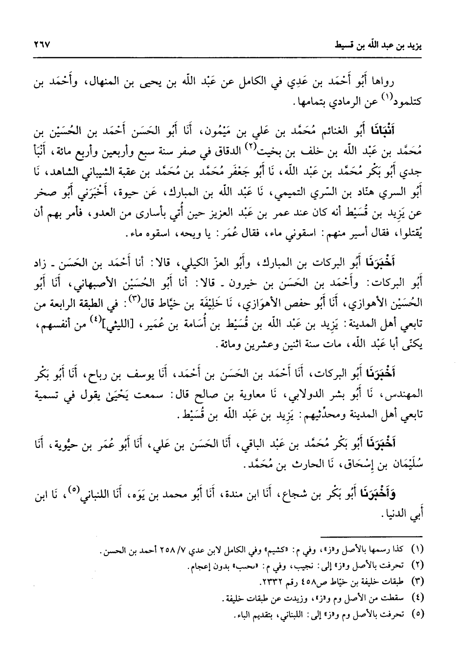 رواها أبو أحمد بن عدي في الكامل عن عبد الله بن يحيى بن المنهال وأحمد بن كتلمود (1) عن الرمادي بتمامها أنبأنا أبو الغنائم محمد بن علي بن ميمون أنا أبو الحسن أحمد بن الحسين بن محمد بن عبد الله بن خلف بن بخيت (2) الدقاق في صفر سنة سبع وأربعين وأربع مائة أنبأ جدي أبو بكر محمد بن عبد الله نا أبو جعفر محمد بن محمد بن عقبة الشيباني الشاهد نا أبو السري هناد بن السري التميمي نا عبد الله بن المبارك عن حيوة أخبرني أبو صخر عن يزيد بن قسيط أنه كان عند عمر بن عبد العزيز حين أتي بأسارى من العدو فأمر بهم أن يقتلوا فقال أسير منهم اسقوني ماء فقال عمر يا ويحه اسقوه ماء أخبرنا أبو البركات بن المبارك وأبو العز الكيلي قالا أنا أحمد بن الحسن زاد أبو البركات وأحمد بن الحسن بن خيرون قالا أنا أبو الحسين الأصبهاني أنا أبو الحسين الأهوازي أنا أبو حفص الأهوازي نا خليفة بن خياط قال (3) في الطبقة الرابعة من تابعي أهل المدينة يزيد بن عبد الله بن قسيط بن أسامة بن عمير الليثي (4) من أنفسهم يكنى أبا عبد الله مات سنة اثنين وعشرين ومائة أخبرنا أبو البركات أنا أحمد بن الحسن بن أحمد أنا يوسف بن رباح أنا أبو بكر المهندس نا أبو بشر الدولابي نا معاوية بن صالح قال سمعت يحيى يقول في تسمية تابعي أهل المدينة ومحدثيهم يزيد بن عبد الله بن قسيط أخبرنا أبو بكر محمد بن عبد الباقي أنا الحسن بن علي أنا أبو عمر بن حيوية أنا سليمان بن إسحاق نا الحارث بن محمد وأخبرنا أبو بكر بن شجاع أنا ابن مندة أنا أبو محمد بن يوه أنا اللنباني (5) نا ابن أبي الدنيا