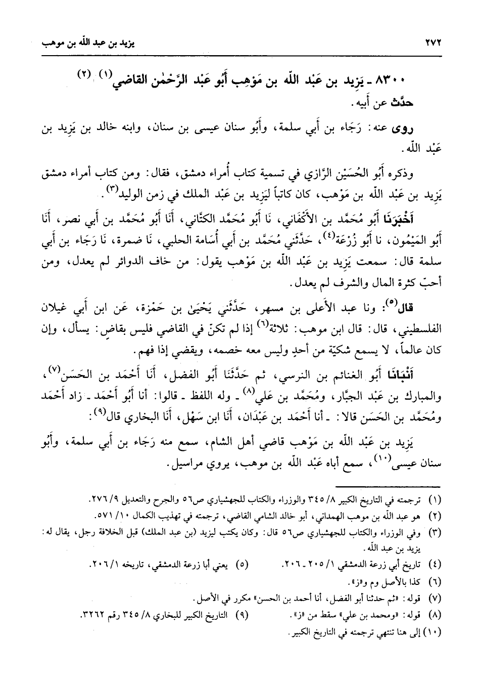 8300 - يزيد بن عبد الله بن موهب أبو عبد الرحمن القاضي (1) (2) حدث عن أبيه روى عنه رجاء بن أبي سلمة وأبو سنان عيسى بن سنان وابنه خالد بن يزيد بن عبد الله وذكره أبو الحسين الرازي في تسمية كتاب أمراء دمشق فقال ومن كتاب أمراء دمشق يزيد بن عبد الله بن موهب كان كاتبا ليزيد بن عبد الملك في زمن الوليد (3) أخبرنا أبو محمد بن الأكفاني نا أبو محمد الكتاني أنا أبو محمد بن أبي نصر أنا أبو الميمون نا أبو زرعة (4) حدثني محمد بن أبي أسامة الحلبي نا ضمرة نا رجاء بن أبي سلمة قال سمعت يزيد بن عبد الله بن موهب يقول من خاف الدوائر لم يعدل ومن أحب كثرة المال والشرف لم يعدل قال (5) ونا عبد الأعلى بن مسهر حدثني يحيى بن حمزة عن ابن أبي غيلان الفلسطيني قال قال ابن موهب ثلاثة (6) إذا لم تكن في القاضي فليس بقاض يسأل وإن كان عالما لا يسمع شكية من أحد وليس معه خصمه ويقضي إذا فهم أنبانا أبو الغنائم بن النرسي ثم حدثنا أبو الفضل أنا أحمد بن الحسن (7) والمبارك بن عبد الجبار ومحمد بن علي (8) وله اللفظ قالوا أنا أبو احمد زاد أحمد ومحمد بن الحسن قالا أنا أحمد بن عبدان أنا ابن سهل أنا البخاري قال (9) يزيد بن عبد الله بن موهب قاضي أهل الشام سمع منه رجاء بن أبي سلمة وأبو سنان عيسى (10) سمع أباه عبد الله بن موهب يروي مراسيل