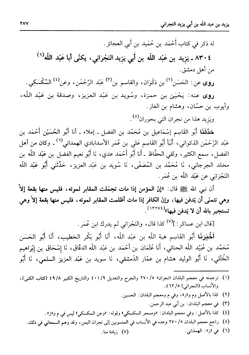 8304 - يزيد بن عبد الله بن أبي يزيد النجراني يكنى أبا عبد الله (1) من أهل دمشق روى عن الحسن (2) بن ذكوان والقاسم بن (3) عبد الرحمن وعن (4) السكسكي روى عنه يحيى بن حمزة وسويد بن عبد العزيز وصدقة بن عبد الله وأيوب بن حسان وهشام بن الغاز ويزيد هذا من نجران التي بحوران (5) حدثنا أبو القاسم إسماعيل بن محمد بن الفضل إملاء أنا أبو الحسين أحمد بن عبد الرحمن الذكواني أنبأ أبو القاسم علي بن عمر الأسد آبادي الهمداني (6) وكان من أهل الفضل سمع الكثير ولقي الحفاظ أنا أبو أحمد عدي نا أبو نعيم الفضل بن عبد الله بن مخلد الجرجاني نا محمد بن المصفى نا سويد بن عبد العزيز حدثني أبو عبد الله النجراني عن عبد الله بن عمر أن نبي الله (صلى الله عليه وسلم) قال إن المؤمن إذا مات تجملت المقابر لموته فليس منها بقعة إلا وهي تتمنى أن يدفن فيها وإن الكافر إذا مات أظلمت المقابر لموته فليس منهابقعة إلا وهي تستجير بالله أن لا يدفن فيها قال ابن عساكر (7) كذا قا والنجراني لم يدرك ابن عمر أخبرنا أبو القاسم هبة الله بن عبد الله أنا أبو بكر الخطيب أنا أبو الحسن محمد بن عبيد الله الحنائي أنا عثمان بن أحمد بن عبد الله الدقاق نا إسحاق بن إبراهيم الختلي نا أبو الوليد هشام بن عمار الدمشقي نا سويد بن عبد العزيز السلمي نا أبو