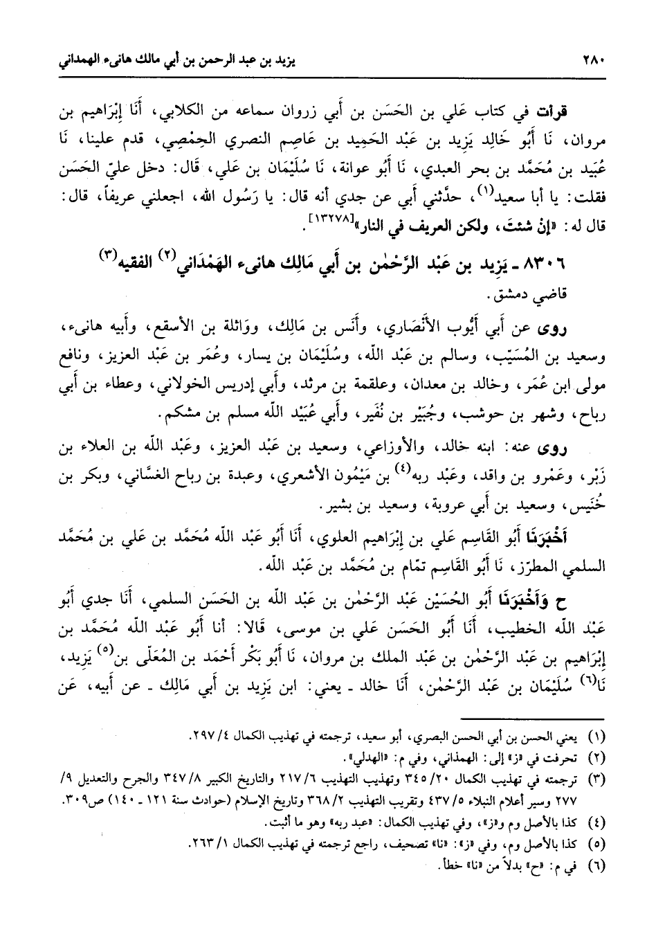 8306 - يزيد بن عبد الرحمن بن أبي مالك هانئ الهمداني (2) الفقيه (3) قاضي دمشق روى عن أبي أيوب الأنصاري وأنس بن مالك وواثلة بن الأسقع وأبيه هانئ وسعيد بن المسيب وسالم بن عبد الله وسليمان بن يسار وعمر بن عبد العزيز ونافع مولى ابن عمر وخالد بن معدان وعلقمة بن مرثد وأبي إدريس الخولاني وعطاء بن أبي رباح وشهر بن حوشب وجبير بن نفير وأبي عبيد الله مسلم بن مشكم روى عنه ابنه خالد والأوزاعي وسعيد بن عبد العزيز وعبد الله بن العلاء بن زبر وعمرو بن واقد وعبد ربه (4) بن ميمون الأشعري وعبدة بن رباح الغساني وبكر بن خنيس وسعيد بن أبي عروبة وسعيد بن بشير أخبرنا أبو القاسم علي بن إبراهيم العلوي أنا أبو عبد الله محمد بن علي بن محمد السلمي المطرز نا أبو القاسم تمام بن محمد بن عبد الله ح وأخبرنا أبو الحسين عبد الرحمن بن عبد الله بن الحسن السلمي أنا جدي أبو عبد الله الخطيب أنا أبو الحسن علي بن موسى قالا أنا أبو عبد الله محمد بن إبراهيم بن عبد الرحمن بن عبد الملك بن مروان نا أبو بكر أحمد بن المعلى بن (5) يزيد نا (6) سليمان بن عبد الرحمن أنا خالديعني ابن يزيد بن أبي مالك عن أبيه عن