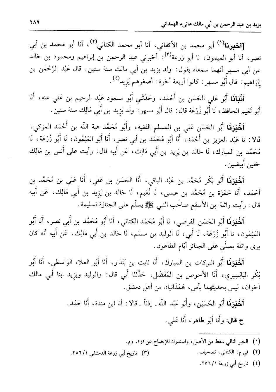 أخبرنا (1) أبو محمد بن الأكفاني أنا أبو محمد الكتاني (2) أنا أبو محمد بن أبي نصر أنا أبو الميمون نا أبو زرعة (3) أخبرني عبد الرحمن بن إبراهيم ومحمود بن خالد عن أبي مسهر أنهما سمعاه يقول ولد يزيد بن أبي مالك سنة ستين قال عبد الرحمن بن إبراهيم قال أبو مسهر كانوا أربعة أخوة أصغرهم يزيد (4) أنبأنا أبو علي الحسن بن أحمد وحدثني أبو مسعود عبد الرحيم بن علي عنه أنا أبو نعيم الحافظ نا أبو زرعة قال قال أبو مسهر ولد يزيد بن أبي مالك سنة ستين أخبرنا أبو الحسن علي بن المسلم الفقيه وأبو محمد هبة الله بن أحمد المزكي قالا نا عبد العزيز بن أحمد أنا أبو محمد بن أبي نصر أنا أبو الميمون نا أبو زرعة نا محمد بن المبارك نا خالد بن يزيد بن أبي مالك عن أبيه قال رأيت على أنس بن مالك خفين أبيضين أخبرنا أبو بكر محمد بن عبد الباقي أنا الحسن بن علي أنا علي بن محمد بن أحمد أنا حمزة بن محمد بن عيسى نا نعيم نا خالد بن يزيد بن أبي مالك عن أبيه قال رأيت واثلة بن الأسقع صاحب النبي (صلى الله عليه وسلم) يسلم على الجنازة تسليمة أخبرنا أبو الحسن الفرضي نا أبو محمد الكتاني أنا أبو محمد بن أبي نصر أنا أبو الميمون نا أبو زرعة نا أبي نا الوليد بن مسلم نا خالد بن أبي مالك عن أبيه أنه كان يرى واثلة يصلي على الجنائز أيام الطاعون أخبرنا أبو البركات بن المبارك أنا ثابت بن بندار أنا أبو العلاء الواسطي أنا أبو بكر البابسيري أنا الأحوص بن المفضل حدثنا أبي قال والوليد ويزيد ابنا أبي مالك أخوان ليس بحديثهما بأس همدانيان من أهل دمشق أخبرنا أبو الحسين وأبو عبد الله إذنا قالا أنا ابن مندة أنا حمد ح قال وأنا أبو طاهر أنا علي