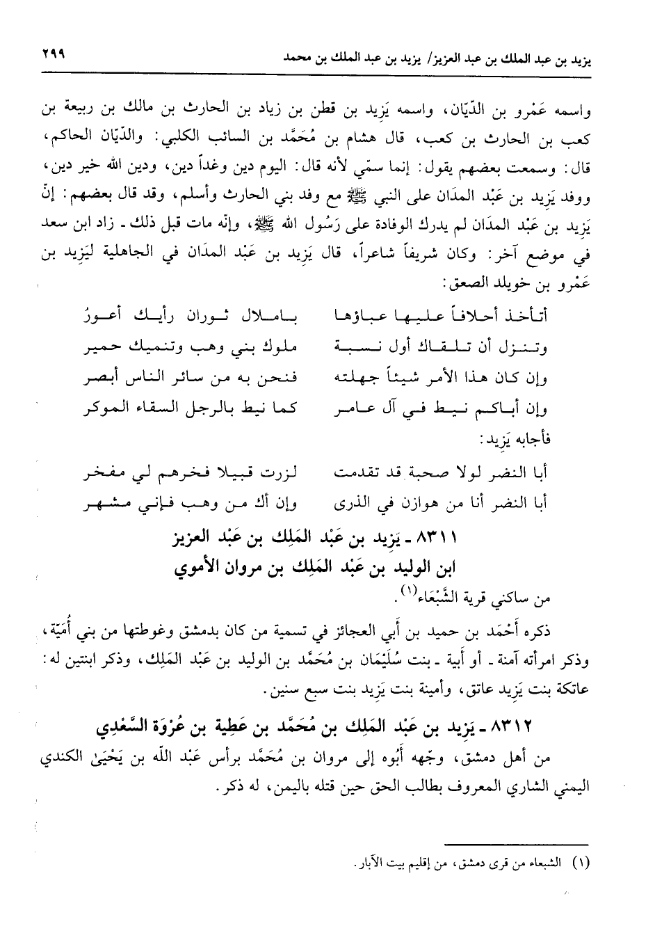 8311 - يزيد بن عبد الملك بن عبد العزيز بن الوليد بن عبد الملك بن مروان الأموي من ساكني قرية الشبعاء (1) ذكره أحمد بن حميد بن أبي العجائز في تسمية من كان بدمشق وغوطتها من بني أمية وذكر امرأته آمنة أو أبية بنت سليمان بن محمد بن الوليد بن عبد الملك وذكر ابنتين له عاتكة بنت يزيد عاتق وأمينة بنت يزيد بنت سبع سنين