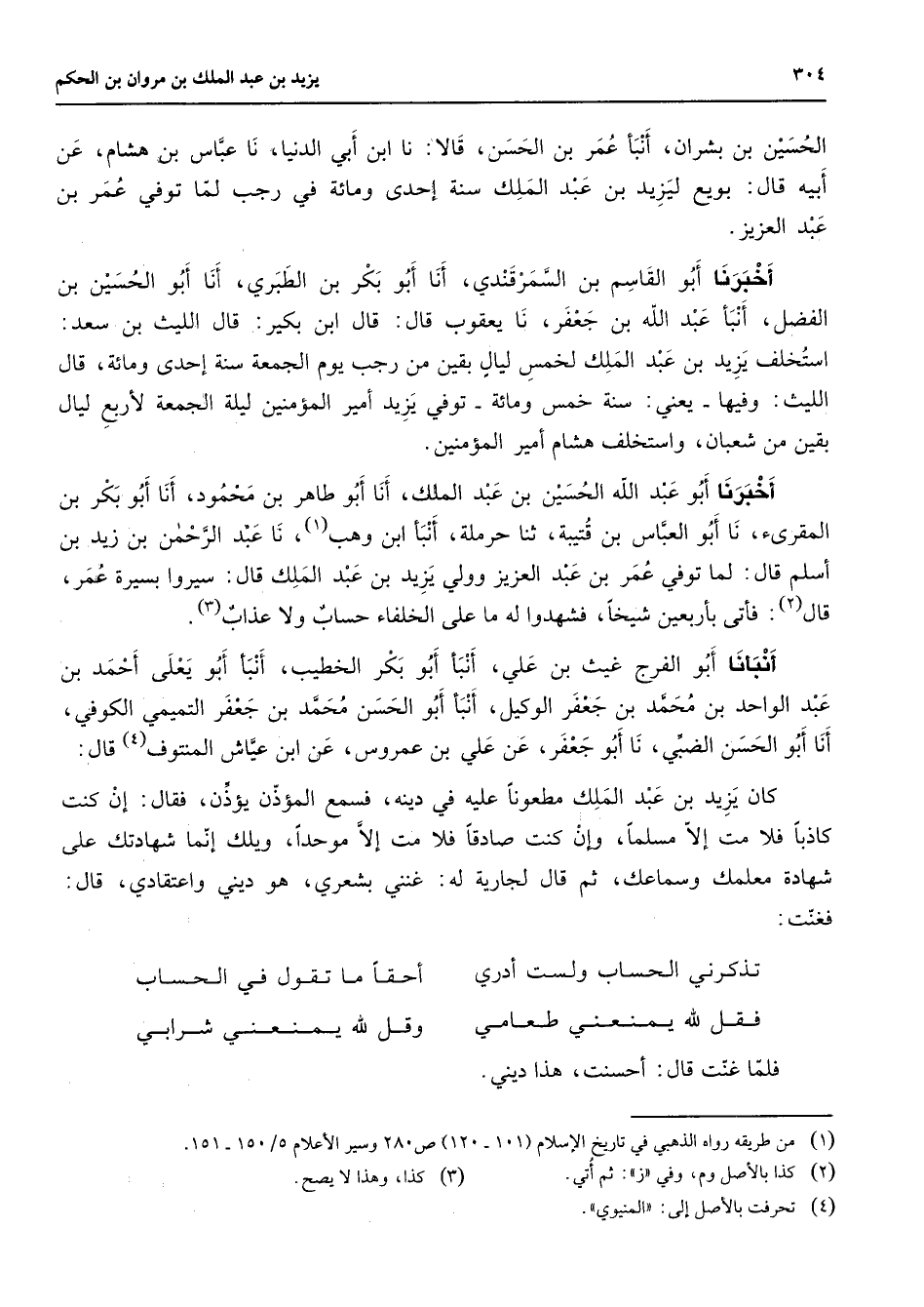 الحسين بن بشران أنبأ عمر بن الحسن قالا نا ابن أبي الدنيا نا عباس بن هشام عن أبيه قال بويع ليزيد بن عبد الملك سنة إحدى ومائة في رجب لما توفي عمر بن عبد العزيز أخبرنا أبو القاسم السمرقندي أنا أبو بكر بن الطبري أنا أبو الحسين بن الفضل أنبأ عبد الله بن جعفر نا يعقوب قال قال ابن بكير قال الليث بن سعد استخلف يزيد بن عبد الملك لخمس ليال بقين من رجب يوم الجمعة سنة إحدى ومائة قال الليث وفيها يعني سنة خمس ومائة توفي يزيد أمير المؤمنين ليلة الجمعة لأربع ليال بقين من شعبان واستخلف هشام أمير المؤمنين أخبرنا أبو عبد الله الحسين بن عبد الملك أنا أبو طاهر بن محمود أنا أبو بكر بن المقرئ نا أبو العباس بن قتيبة ثنا حرملة أنبأ ابن وهب (1) نا عبد الرحمن بن زيد بن أسلم قال لما توفي عمر بن عبد العزيز وولي يزيد بن عبد الملك قال سيروا بسيرة عمر قال (2) فأتى بأربعين شيخا فشهدوا له ما على الخلفاء حساب ولا عذاب (4) أنبأنا أبو الفرج غيث بن علي أنبأ أبو بكر الخطيب أنبأ أبو يعلى أحمد بن عبد الواحد بن محمد بن جعفر الوكيل أنبأ أبو الحسن محمد بن جعفر التميمي الكوفي أنا أبو الحسن الضبي نا أبو جعفر عن علي بن عمروس عن ابن عياش المنتوف (4) قال كان يزيد بن عبد الملك مطعونا عليه في دينه فسمع المؤذن يؤذن فقال إن كنت كاذبا فلا مت إلا مسلما وإن كنت صادقا فلا مت إلا موحدا ويلك إنما شهادتك على شهادة معلمك وسماعك ثم قال لجارية له غنني بشعري هو ديني واعتقادي قال فغنت تذكرني الحساب ولست أدري * أحقا ما تقول في الحساب فقل لله يمنعني طعامي * وقل لله يمنعني شرابي * فلما غنت قال أحسنت هذا ديني
