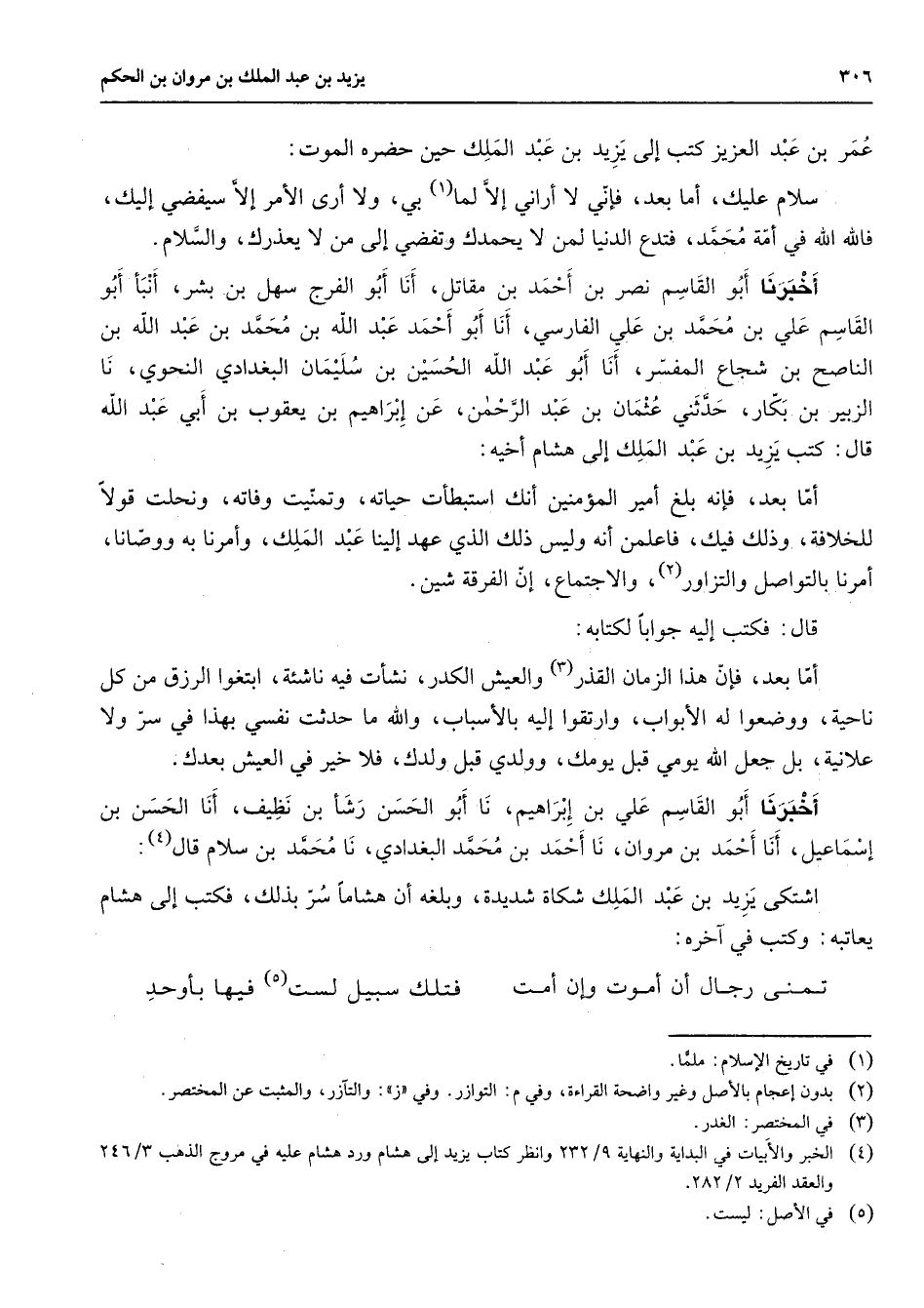 عمر بن عبد العزيز كتب إلى يزيد بن عبد الملك حين حضره الموت سلام عليك أما بعد فإني لا أراني إلا لما (1) بي ولا أرى الأمر إلا سيفضي إليك فالله الله في أمة محمد فتدع الدنيا لمن لا يحمدك وتفضي إلى من لا يعذرك والسلام أخبرنا أبو القاسم نصر بن أحمد بن مقاتل أنا أبو الفرج سهل بن بشر أنبأ أبو القاسم علي بن محمد بن علي الفارسي أنا أبو أحمد عبد الله بن محمد بن عبد الله بن الناصح بن شجاع المفسر أنا أبو عبد الله الحسين بن سليمان البغدادي النحوي نا الزبير بن بكار حدثني عثمان بن عبد الرحمن عن إبراهيم بن يعقوب بن أبي عبد الله قال كتب يزيد بن عبد الملك إلى هشام أخيه أما بعدفإنه بلغ أمير المؤمنين أنك استبطأت حياته وتمنيت وفاته ونحلت قولا للخلافة وذلك فيك فاعلمن أنه وليس ذلك الذي عهد إلينا عبد الملك وأمرنا به ووصانا أمرنا بالتواصل والتزاور (2) والاجتماع إن الفرقة شين قال فكتب إليه جوابا لكتابه أما بعد فإن هذا الزمان القذر (3) والعيش الكدر نشأت فيه ناشئة ابتغوا الرزق من كل ناحية ووضعوا له الأبواب وارتقوا إليه بالأسباب والله ما حدثت نفسي بهذا في سر ولا علانية بل جعل الله يومي قبل يومك وولدي قبل ولدك فلا خير في العيش بعدك أخبرنا أبو القاسم علي بن إبراهيم نا أبو الحسن رشأ بن نظيف أنا الحسن بن إسماعيل أنا أحمد بن مروان نا أحمد بن محمد البغدادي نا محمد بن سلام قال (4) اشتكى يزيد بن عبد الملك شكاة شديدة وبلغه أن هشاما سر بذلك فكتب إلى هشام يعاتبه وكتب في آخره تمنى رجال أن أموت وإن أمت * فتلك سبيل لست (5) فيها بأوحد