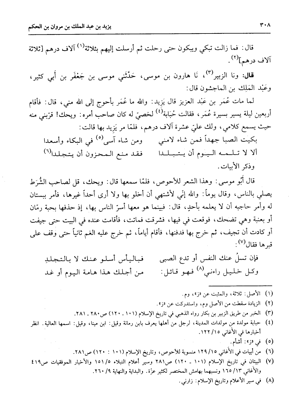 قال فما زالت تبكي ويبكون حتى رحلت ثم أرسلت إليهم بثلاثة (1) آلاف درهم ثلاثة آلاف درهم (2) قال ونا الزبير (3) نا هارون بن موسى حدثني موسى بن جفعر بن أبي كثير وعبد الملك بن الماجشون قال لما مات عمر بن عبد العزيز قال يزيد والله ما عمر بأحوج إلى الله مني قال فأقام أربعين ليلة يسير بسيرة عمر فقالت حبابة (4) لخصي له كان صاحب أمره ويحك قربني منه حيث يسمع كلامي ولك علي عشرة آلاف درهم فلما مر يزيد بها قالت بكيت الصبا جهدا فمن شاء لامني * ومن شاء آسى (5) في البكاء وأسعدا ألا لا تلمه اليوم أن يتبلدا * فقد منع المحزون أن يتجلدا (6) * وذكر الأبيات قال أبو موسى وهذا الشعر للأحوص فلما سمعها قال ويحك قل لصاحب الشرط يصلي بالناس وقال يوما والله إني لأشتهي أن أخلو بها ولا أرى أحدا غيرها فأمر ببستان له وأمر حاجبه أن لا يعلمه بأحد قال فبينما هو معها أسر الناس بها إذ حذفها بحبة رمان أو بعنبة وهي تضحك فوقعت في فيها فشرقت فماتت فأقامت عنده في البيت حتى جيفت أو كادت أن تجيف ثم خرج بها فدفنها فأقام أياما ثم خرج عليه الغم ثانيا حتى وقف على قبرها فقال (7) فإن تسل عنك النفس أو تدع الصبى * فباليأس أسلو عنك لا بالتجلد وكل خليل راءني (8) فهو قائل * من أجلك هذا هامة اليوم أو غد