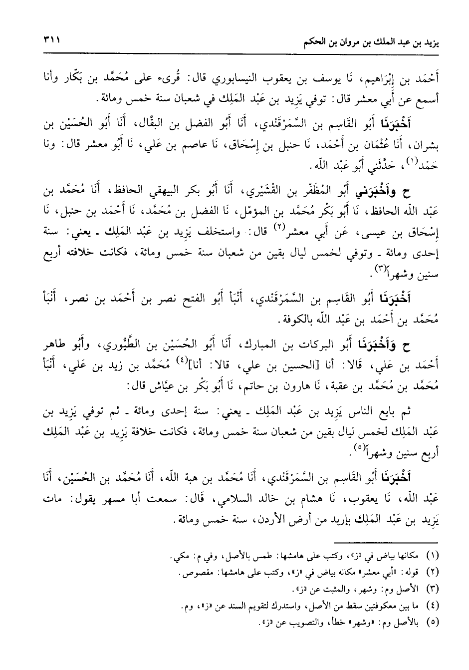 أحمد بن إبراهيم نا يوسف بن يعقوب النيسابوري قال قرئ على محمد بن بكار وأنا أسمع عن أبي معشر قال توفي يزيد بن عبد الملك في شعبان سنة خمس ومائة أخبرنا أبو القاسم السمرقندي أنا أبو الفضل بن البقال أنا أبو الحسين بن بشران أنا عثمان بن أحمد نا حنبل بن إسحاق نا عاصم بن علي نا أبو معشر قال ونا حمد (1) حدثني أبو عبد الله ح وأخبرني أبو المظفر بن القشيري أنا أبو بكر البيهقي الحافظ أنا محمد بن عبد الله الحافظ نا أبو بكر محمد بن المؤمل نا الفضل بن محمد نا أحمد بن حنبل نا إسحاق بن عيسى عن أبي معشر (2) قال واستلخف يزيد بن عبد الملك يعني سنة إحدى ومائة توفي لخمس ليال بقين من شعبان سنة خمس ومائة فكانت خلافته أربع سنين وشهرا (3) أخبرنا أبو القاسم بن السمرقندي أنبأ أبو الفتح نصر بن أحمد بن نصر أنبأ محمد بن أحمد بن عبد الله بالكوفة ح وأخبرنا أبو البركات بن المبارك أنا أبو الحسين بن الطيوري وأبو طاهر أحمد بن علي قالا أنا الحسين بن علي قالا أنا (4) محمد بن زيد بن علي أنبأ محمد بن محمد بن عقبة نا هارون بن حاتم نا أبو بكر بن عياش قال ثم بايع الناس يزيد بن عبد الملك يعني سنة إحدى ومائة ثم توفي يزيد بن عبد الملك لخمس ليال بقين من شعبان سنة خمس ومائة فكانت خلافة يزيد بن عبد الملك أربع سنين وشهرا (5) أخبرنا أبو القاسم السمرقندي أنا محمد بن هبة الله أنا محمد بن الحسين أنا عبد الله نا يعقوب نا هشام بن خالد السلامي قال سمعت أبا مسهر يقول مات يزيد بن عبد الملك بإربد من أرض الأردن سنة خمس ومائة