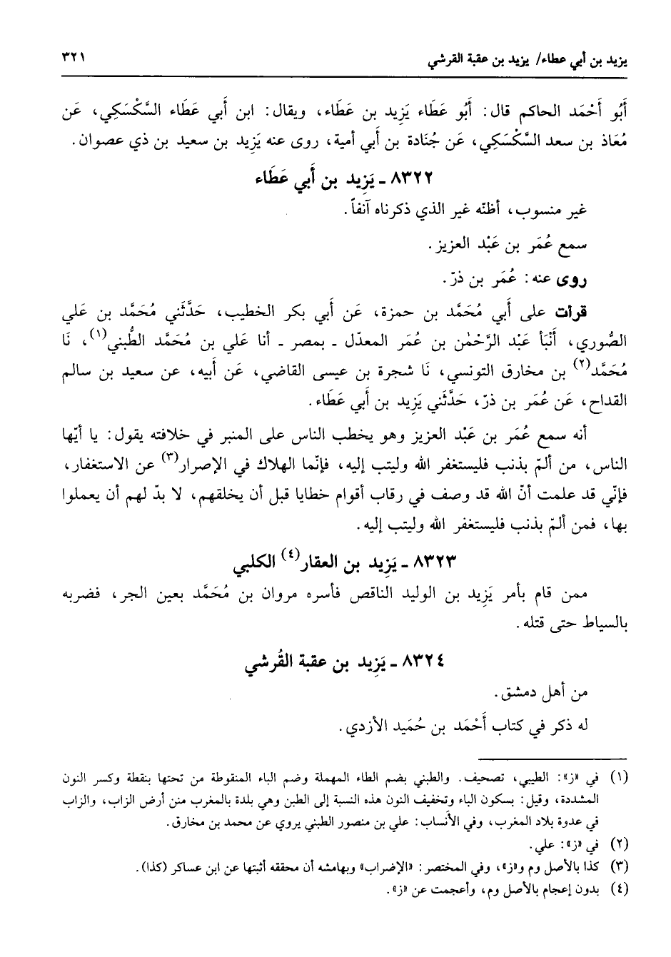 8322 - يزيد بن أبي عطاء غير منسوب أظنه غير الذي ذكرناه آنفا سمع عمر بن عبد العزيز روى عنه عمر بن ذر قرأت على أبي محمد بن حمزة عن أبي بكر الخطيب حدثني محمد بن علي الصوري أنبأ عبد الرحمن بن عمر المعدل بمصر أنا علي بن محمد الطبني (1) نا محمد (2) بن مخارق التونسي نا شجرة بن عيسى القاضي عن أبيه عن سعيد بن سالم القداح عن عمر بن ذر حدثني يزيد بن أبي عطاء أنه سمع عمر بن عبد العزيز وهو يخطب الناس على المنبر في خلافته يقول يا أيها الناس من ألم بذنب فليستغفر الله وليتب إليه فإنما الهلاك في الإصرار (3) عن الاستغفار فإني قد علمت أن الله قد وصف في رقاب أقوام خطايا قبل أن يخلقهم لا بد لهم أن يعملوا بها فمن ألم بذنب فليستغفر الله وليتب إليه