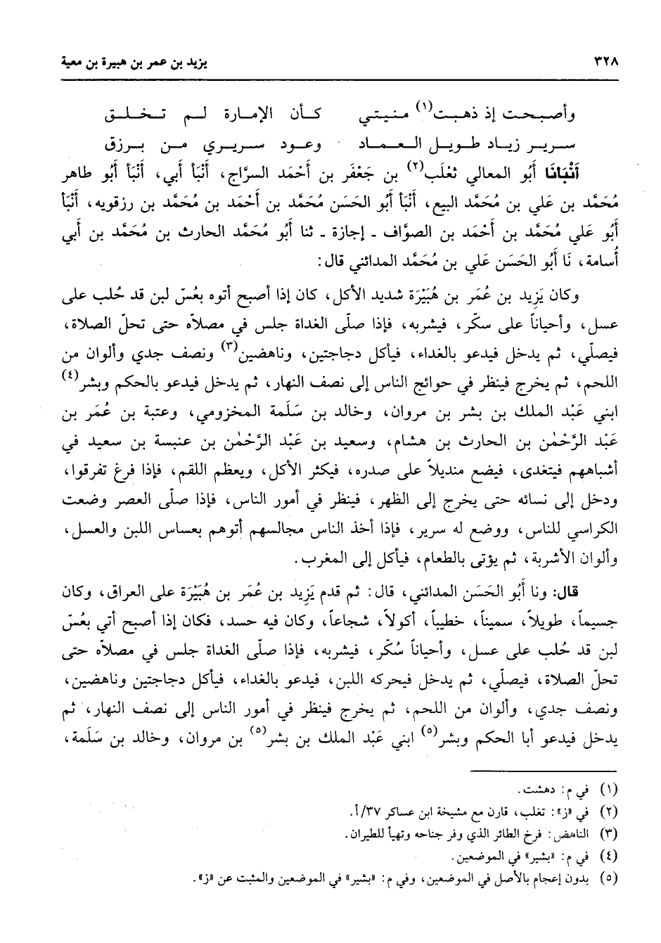 وأصبحت إذ ذهبت (1) منيتي * كأن الإمارة لم تخلق سرير زياد طويل العماد * وعود سريري من برزق * أنبأنا أبو المعالي ثعلب (2) بن جعفر بن أحمد السراج أنبأ أبي أنبأ أبو طاهر محمد بن علي بن محمد البيع أنبأ أبو الحسن محمد بن أحمد بن محمد بن رزقويه أنبأ أبو علي محمد بن أحمد بن الصواف إجازة ثنا أبو محمد الحارث بن محمد بن أبي أسامة نا أبو الحسن علي بن محمد المدائني قال وكان يزيد بن عمر بن هبيرة شديد الأكل كان إذا أصبح أتوه بعس لبن قد حلب على عسل وأحيانا على سكر فيشربه فإذا صلى الغداة جلس في مصلاه حتى تحل الصلاة فيصلي ثم يدخل فيدعو بالغداء فيأكل دجاجتين وناهضين (3) ونصف جدي وألوان من اللحم ثم يخرج فينظر في حوائج الناس إلى نصف النهار ثم يدخل فيدعو بالحكم وبشر (4) ابني عبد الملك بن بشر بن مروان وخالد بن سلمة المخزومي وعتبة بن عمر بن عبد الرحمن بن الحارث بن هشام وسعيد بن عبد الرحمن بن عنبسة بن سعيد في أشباههم فيتغدى فيضع منديلا على صدره فيكثر الأكل ويعظم اللقم فإذا فرغ تفرقوا ودخل إلى نسائه حتى يخرج إلى الظهر فينظر في أمور الناس فإذا صلى العصر وضعت الكراسي للناس ووضع له سرير فإذا أخذ الناس مجالسهم أتوهم بعساس اللبن والعسل وألوان الأشربة ثم يؤتى بالطعام فيأكل إلى المغرب قال ونا أبو الحسن المدائني قال ثم قدم يزيد بن عمر بن هبيرة على العراق وكان جسيما طويلا سمينا خطيبا أكولا شجاعا وكان فيه حسد فكان إذا أصبح أتي بعس لبن قد حلب على عسل وأحيانا سكر فيشربه فإذا صلى الغداة جلس في مصلاه حتى تحل الصلاة فيصلي ثم يدخل فيحركه اللبن فيدعو بالغداء فيأكل دجاجتين وناهضين ونصف جدي وألوان من اللحم ثم يخرج فينظر في أمور الناس إلى نصف النهار ثم يدخل فيدعو أبا الحكم وبشر (5) ابني عبد الملك بن بشر بن مروان وخالد بن سلمة