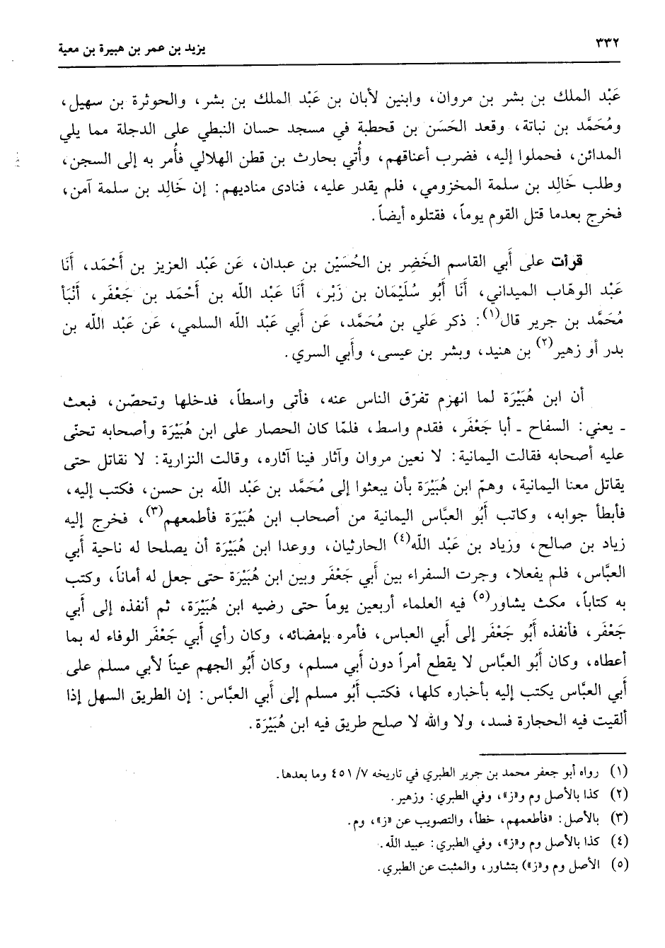 عبد الملك بن بشر بن مروان وابنين لأبان بن عبد الملك بن بشر والحوثرة بن سهيل ومحمد بن نباتة وقعد الحسن بن قحطبة في مسجد حسان النبطي على الدجلة مما يلي المدائن فحملوا إليه فضرب أعناقهم وأتي بحارث بن قطن الهلالي فأمر به إلى السجن وطلب خالد بن سلمة المخزومي فلم يقدر عليه فنادى مناديهم إن خالد بن سلمة آمن فخرج بعدما قتل القوم يوما فقتلوه أيضا قرأت على أبي القاسم الخضر بن الحسين بن عبدان عن عبد العزيز بن أحمد أنا عبد الوهاب الميداني أنا أبو سليمان بن زبر أنا عبد الله بن أحمد بن جعفر أنبأ محمد بن جرير قال (1) ذكر علي بن محمد عن أبي عبد الله السلمي عن عبد الله بن بدر أو زهير (2) بن هنيد وبشر بن عيسى وأبي السري أن ابن هبيرة لما انهزم تفرق الناس عنه فأتى واسطا فدخلها وتحصن فبعث يعني السفاح أبا جعفر فقدم واسط فلما كان الحصار على ابن هبيرة وأصحابه تحنى عليه أصحابه فقالت اليمانية لا نعين مروان وآثار فينا آثاره وقالت النزارية لا نقاتل حتى يقاتل معنا اليمانية وهم ابن هبيرة بأن يبعثوا إلى محمد بن عبد الله بن حسن فكتب إليه فأبطأ جوابه وكاتب أبو العباس اليمانية من أصحاب ابن هبيرة فأطمعهم (3) فخرج إليه زياد بن صالح وزياد بن (4) عبد الله الحارثيان ووعدا ابن هبيرة أن يصلحا له ناحية أبي العباس فلم يفعلا وجرت السفراء بين أبي جعفر وبين ابن هبيرة حتى جعل له أمانا وكتب به كتابا مكث يشاور (5) فيه العلماء أربعين يوما حتى رضيه ابن هبيرة ثم أنفذه إلى أبي جعفر فأنفذه أبو جعفر إلى أبي العباس فأمره بإمضائه وكان رأي أبي جعفر الوفاء له بما أعطاه وكان أبو العباس لا يقطع أمرا دون أبي مسلم وكان أبو الجهم عينا لأبي مسلم على أبي العباس يكتب إليه بأخباره كلها فكتب أبو مسلم إلى أبي العباس إن الطريق السهل إذا ألقيت فيه الحجارة فسد ولا والله لا صلح طريق فيه ابن هبيرة