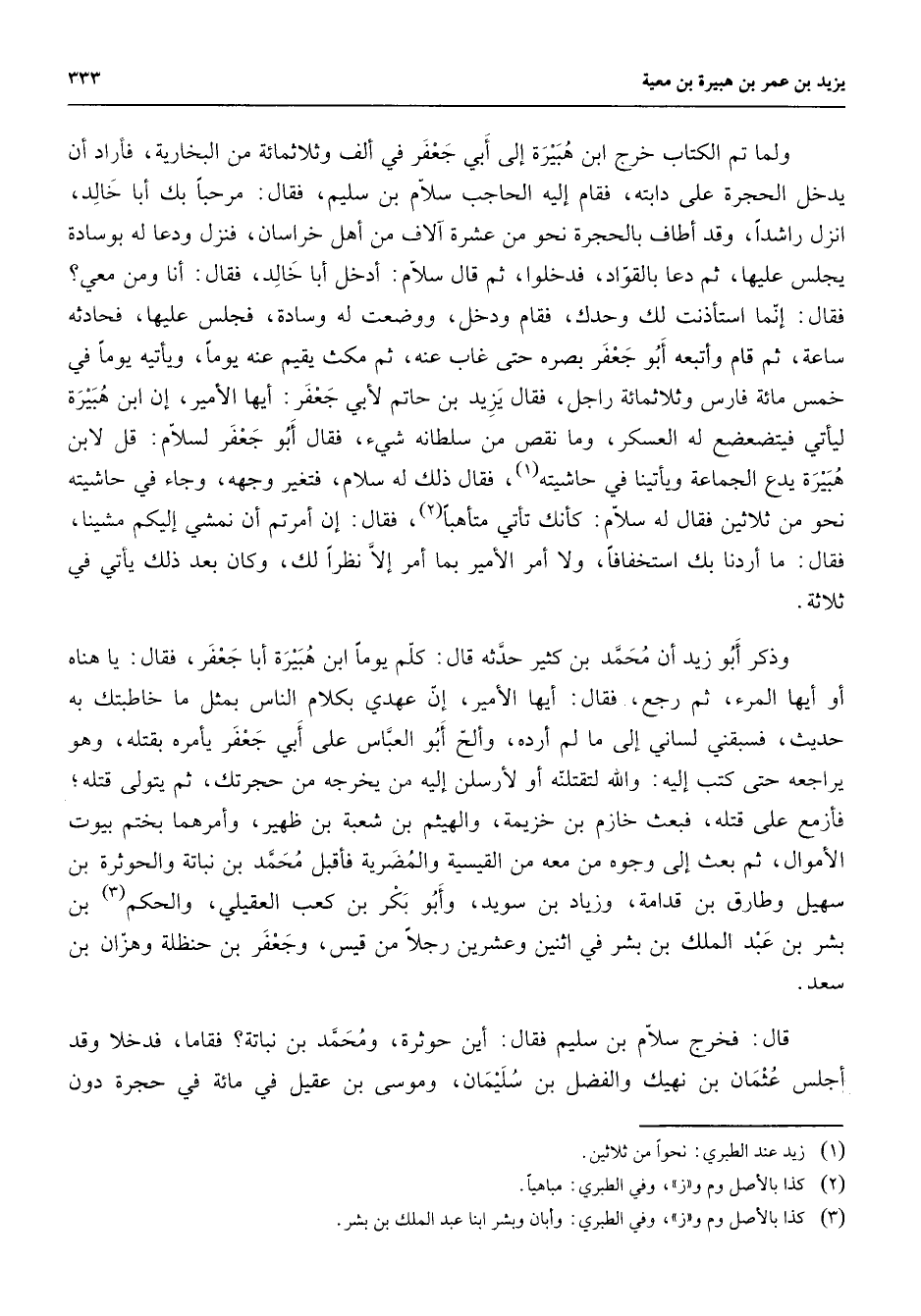 ولما تم الكتاب خرج ابن هبيرة إلى أبي جعفر في ألف وثلاثمائة من البخارية فأراد أن يدخل الحجرة على دابته فقام إليه الحاجب سلام بن سليم فقال مرحبا بك أبا خالد انزل راشدا وقد أطاف بالحجرة نحو من عشرة آلاف من أهل خراسان فنزل ودعا له بوسادة يجلس عليها ثم دعا بالقواد فدخلوا ثم قال سلام أدخل أبا خالد فقال أنا ومن معي فقال إنما استأذنت لك وحدك فقام ودخل ووضعت له وسادة فجلس عليها فحادثه ساعة ثم قام وأتبعه أبو جعفر بصره حتى غاب عنه ثم مكث يقيم عنه يوما ويأتيه يوما في خمس مائة فارس وثلاثمائة راجل فقال يزيد بن حاتم لأبي جعفر أيها الأمير إن ابن هبيرة ليأتي فيتضعضع له العسكر وما نقص من سلطانه شئ فقال أبو جعفر لسلام قل لابن هبيرة يدع الجماعة ويأتينا في حاشيته (1) فقال ذلك له سلام فتغير وجهه وجاء في حاشيته نحو من ثلاثين فقال له سلام كأنك تأتي متأهبا (2) فقال إن أمرتم أن نمشي إليكم مشينا فقال ما أردنا بك استخفافا ولا أمر الأمير بما أمر إلا نظرا لك وكان بعد ذلك يأتي في ثلاثة وذكر أبو زيد أن محمد بن كثير حدثه قال كلم يوما ابن هبيرة أبا جعفر فقال يا هناه أو أيها المرء ثم رجع فقال أيها الأمير إن عهدي بكلام الناس بمثل ما خاطبتك به حديث فسبقني لساني إلى ما لم أرده وألح أبو العباس على أبي جعفر يأمره بقتله وهو يراجعه حتى كتب إليه والله لتقتلنه أو لأرسلن إليه من يخرجه من حجرتك ثم يتولى قتله فأزمع على قتله فبعث خازم بن خزيمة والهيثم بن شعبة بن ظهير وأمرهما بختم بيوت الأموال ثم بعث إلى وجوه من معه من القيسية والمضرية فأقبل محمد بن نباتة والحوثرة بن سهيل وطارق بن قدامة وزياد بن سويد وأبو بكر بن كعب العقيلي والحكم (3) بن بشر بن عبد الملك بن بشر في اثنين وعشرين رجلا من قيس وجعفر بن حنظلة وهزان بن سعد قال فخرج سلام بن سليم فقال أين حوثرة ومحمد بن نباتة فقاما فدخلا وقد أجلس عثمان بن نهيك والفضل بن سليمان وموسى بن عقيل في مائة في حجرة دون