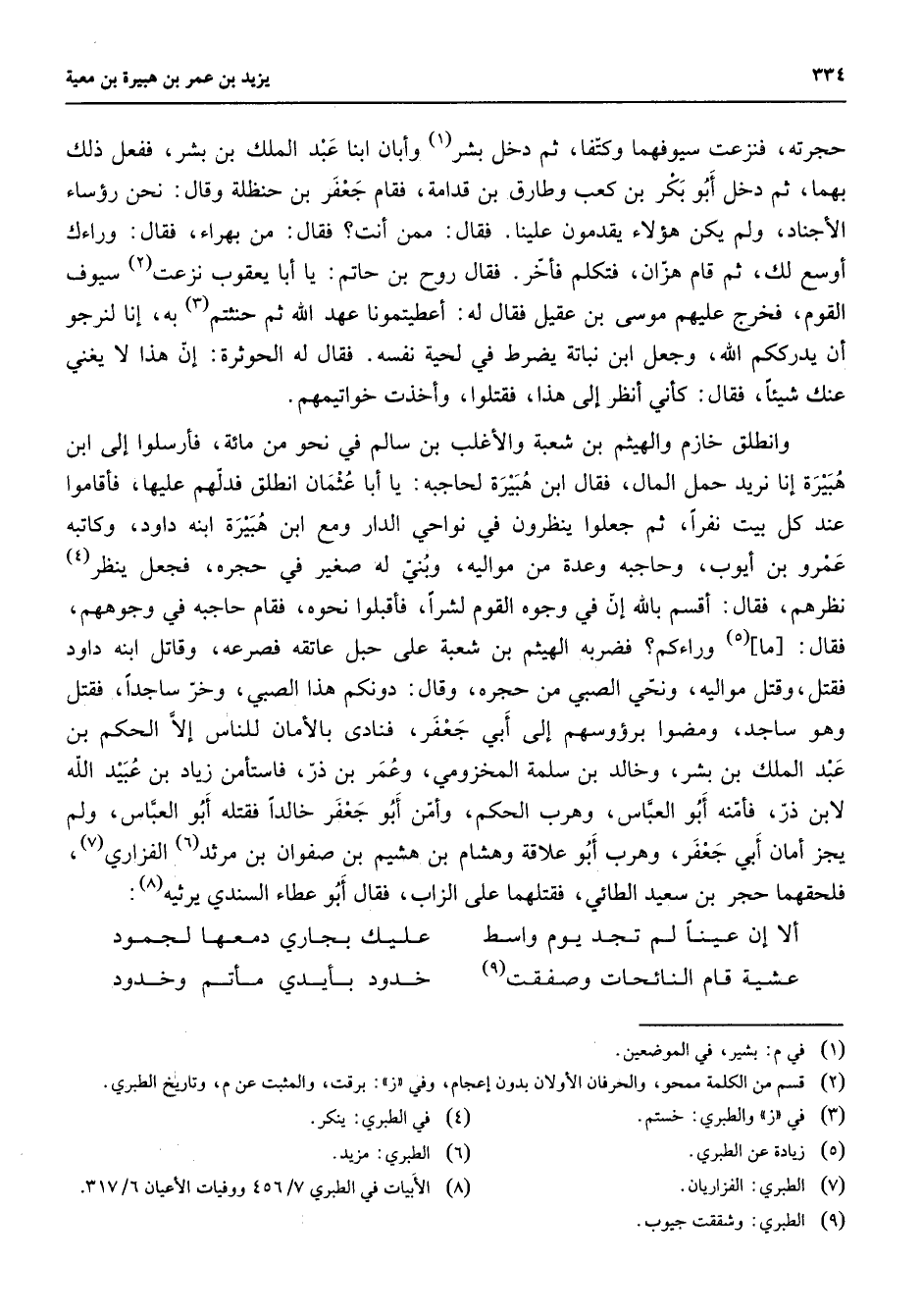 حجرته فنزعت سيوفهما وكتفا ثم دخل بشر (1) وأبان ابنا عبد الملك بن بشر ففعل ذلك بهما ثم دخل أبو بكر بن كعب وطارق بن قدامة فقام جعفر بن حنظلة وقال نحن رؤساء الأجناد ولم يكن هؤلاء يقدمون علينا فقال ممن أنت فقال من بهراء فقال وراءك أوسع لك ثم قام هزان فتكلم فأخر فقال روح بن حاتم يا أبا يعقوب نزعت (2) سيوف القوم فخرج عليهم موسى بن عقيل فقال له أعطيتمونا عهد الله ثم حنثتم (3) به إنا لنرجو أن يدرككم الله وجعل ابن نباتة يضرط في لحية نفسه فقال له الحوثرة إن هذا لا يغني عنك شيئا فقال كأني أنظر إلى هذا فقتلوا وأخذت خواتيمهم وانطلق خازم والهيثم بن شعبة والأغلب بن سالم في نحو من مائة فأرسلوا إلى ابن هبيرة إنا نريد حمل المال فقال ابن هبيرة لحاجبه يا أبا عثمان انطلق فدلهم عليها فأقاموا عند كل بيت نفرا ثم جعلوا ينظرون في نواحي الدار ومع ابن هبيرة ابنه داود وكاتبه عمرو بن أيوب وحاجبه وعدة من مواليه وبني له صغير في حجره فجعل ينظر (4) نظرهم فقال أقسم بالله إن في وجوه القوم لشرا فأقبلوا نحوه فقام حاجبه في وجوههم فقال ما (5) وراءكم فضربه الهيثم بن شعبة على حبل عاتقه فصرعه وقاتل ابنه داود فقتل وقتل مواليه ونحي الصبي من حجره وقال دونكم هذا الصبي وخر ساجدا فقتل وهو ساجد ومضوا برؤوسهم إلى أبي جعفر فنادى بالأمان للناس إلا الحكم بن عبد الملك بن بشر وخالد بن سلمة المخزومي وعمر بن ذر فاستأمن زياد بن عبيد الله لابن ذر فأمنه أبو العباس وهرب الحكم وأمن أبو جعفر خالدا فقتله أبو العباس ولم يجز أمان أبي جعفر وهرب أبو علاقة وهشام بن هشيم بن صفوان بن مرثد (6) الفزاري (7) فلحقهما حجر بن سعيد الطائي فقتلهما على الزاب فقال أبو عطاء السندي يرثيه (8) ألا إن عينا لم تجد يوم واسط * عليك بجاري دمعها لجمود عشية قام النائحات وصفقت * (9) خدود بأيدي مأتم وخدود