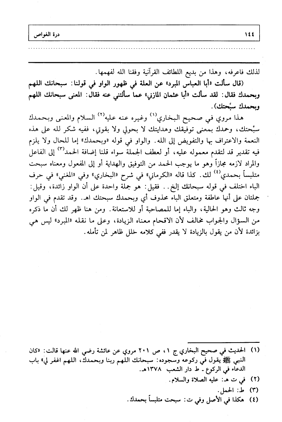 (قال سألت "أبا العباس المبرد" عن العلة في ظهور الواو في قولنا: سبحانك اللهم وبحمدك فقال: لقد سألت "أبا عثمان المازني" عما سألتني عنه فقال: المعنى سبحانك اللهم وبحمدك سبَّحتك).