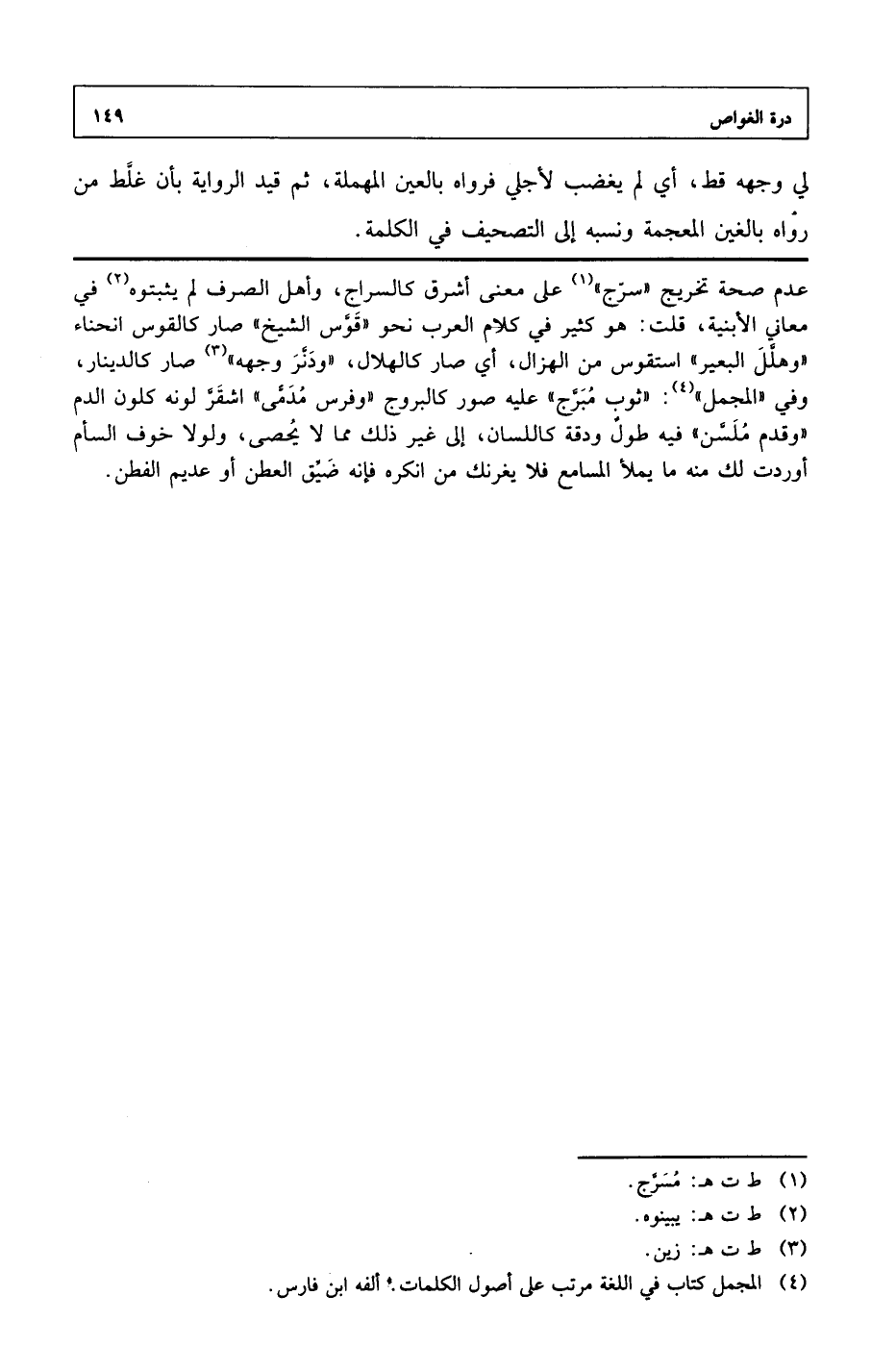 عدم صحة تخريج "سرج" على معنى أشرق كالسراج، وأهل الصرف لم يثبتوه في معاني الأبنية، قلت: هو كثير في كلام العرب نحو "قوَّس الشيخ" صار كالقوس انحناء "وهلل البعير" استقوس من الهزال، أي صار كالهلال، "ودَنَّر وجهه" صار كالدينار، وفي "المجمل": "ثوب مبرَّج" عليه صور كالبروج "وفرس مدمَّى" اشقَرَّ لونه كلون الدم "وقدم مُلَسَّن" فيه طولٌ ودقة اللسان، إلى غير ذلك مما لا يحصى، ولولا خوف السأم أوردت لك منه ما يملأ المسامع فلا يغرنك من أنكره فإنه ضيق العطن أو عدم الفطن.