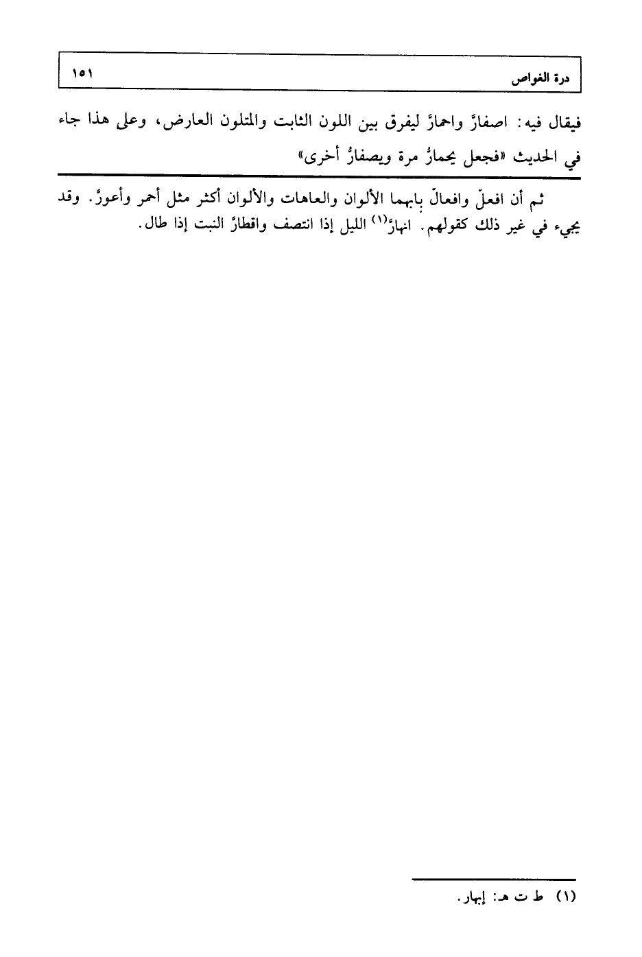 فيقال فيه: اصفارَّ واحمارَّ ليفرق بين اللون الثابت والمتلون العارض، وعلى هذا جاء في الحديث "فجعل يحمارَّ مرة ويصفارُّ أخرى".
