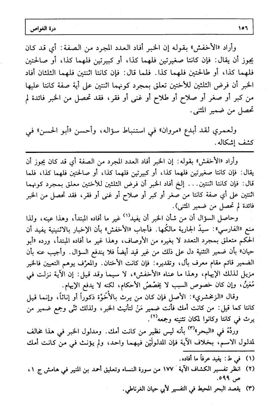 وأراد "الأخفش" بقوله إن الخبر أفاد العدد المجرد من الصفة: اي قد كان يجوز أن يقال: فإن كانتا صغيرتين فلهما كذا، أو كبيرتين فلهما كذا، أو صالحتين فلهما كذا، أو طالحتين فلهما كذا. فلما قال: فإن كانتا اثنتين فلهما الثلثان افاد الخبر أن فرض الثلثين للأختين تعلق بمجرد كونهما اثنتين على أية صفة كانتا عليها من كبر أو صغر أو صلاح أو طلاح أو غنى أو فقر، فقد تحصل من الخبر فائدة لم تحصل من ضمير المثنى.