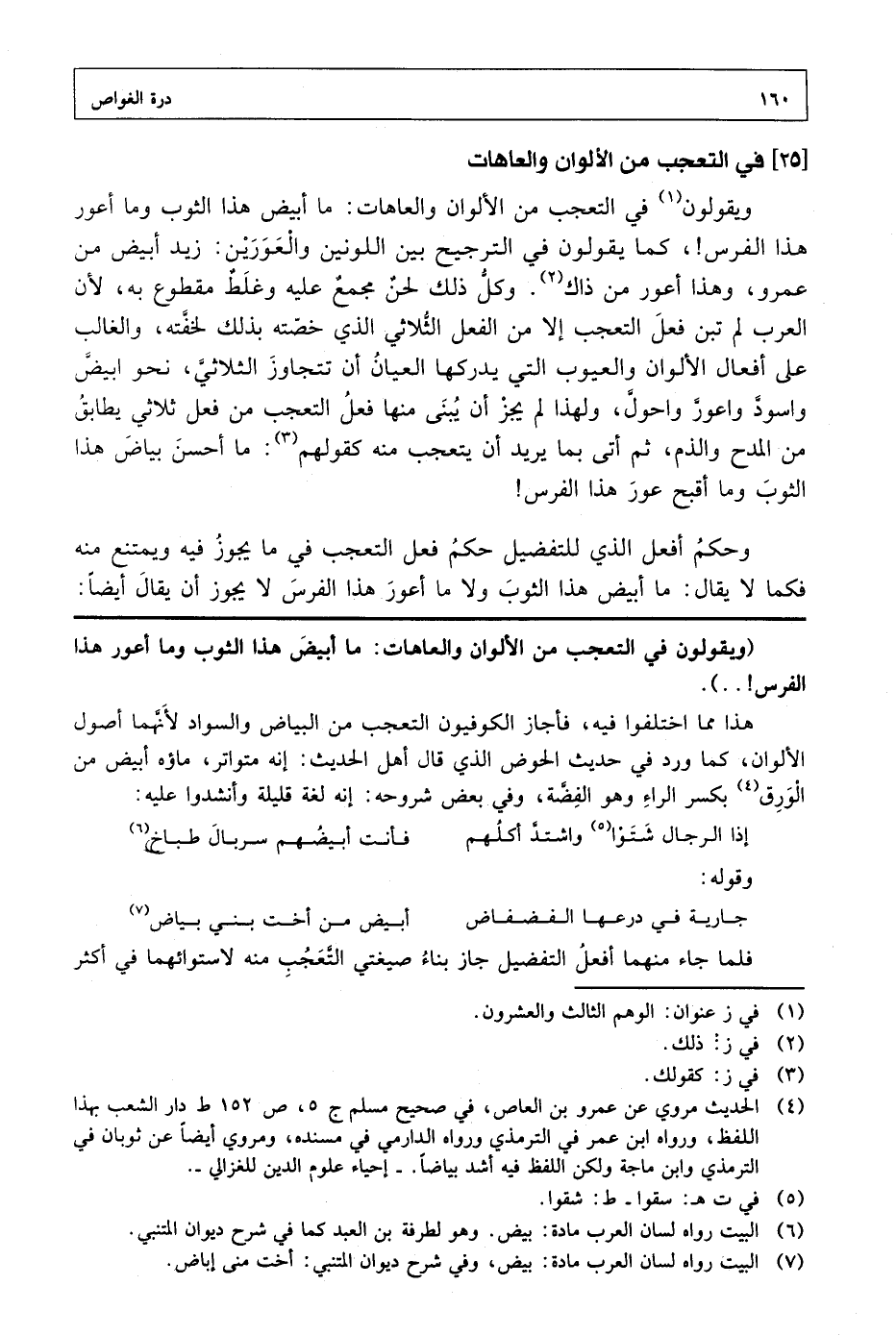 (ويقولون في التعجب من الألوان والعاهات: ما أبيض هذا الثوب وما أعور هذا الفرس .. ).
