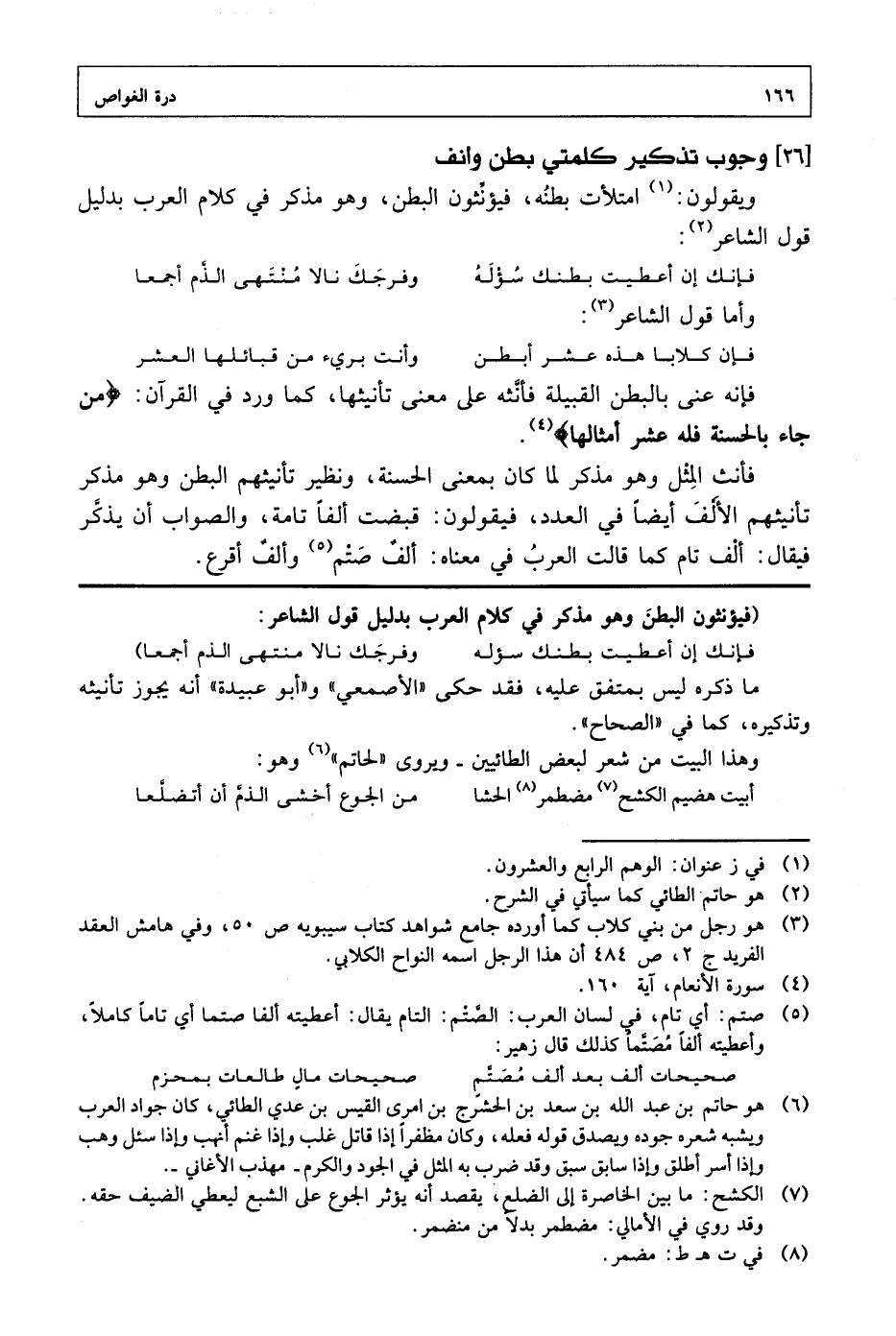 فأنت المثل وهو مذكر لما كان بمعنى الحسنة، ونظير تأنيثهم البطن وهو مذكر تأنيثهم الألف أيضا في العدد، فيقولون: قبضت ألفا تامة، والصواب أن يذكر فيقال: ألف تام كما قالت العرب في معناه: ألف صتم وألف أقرع