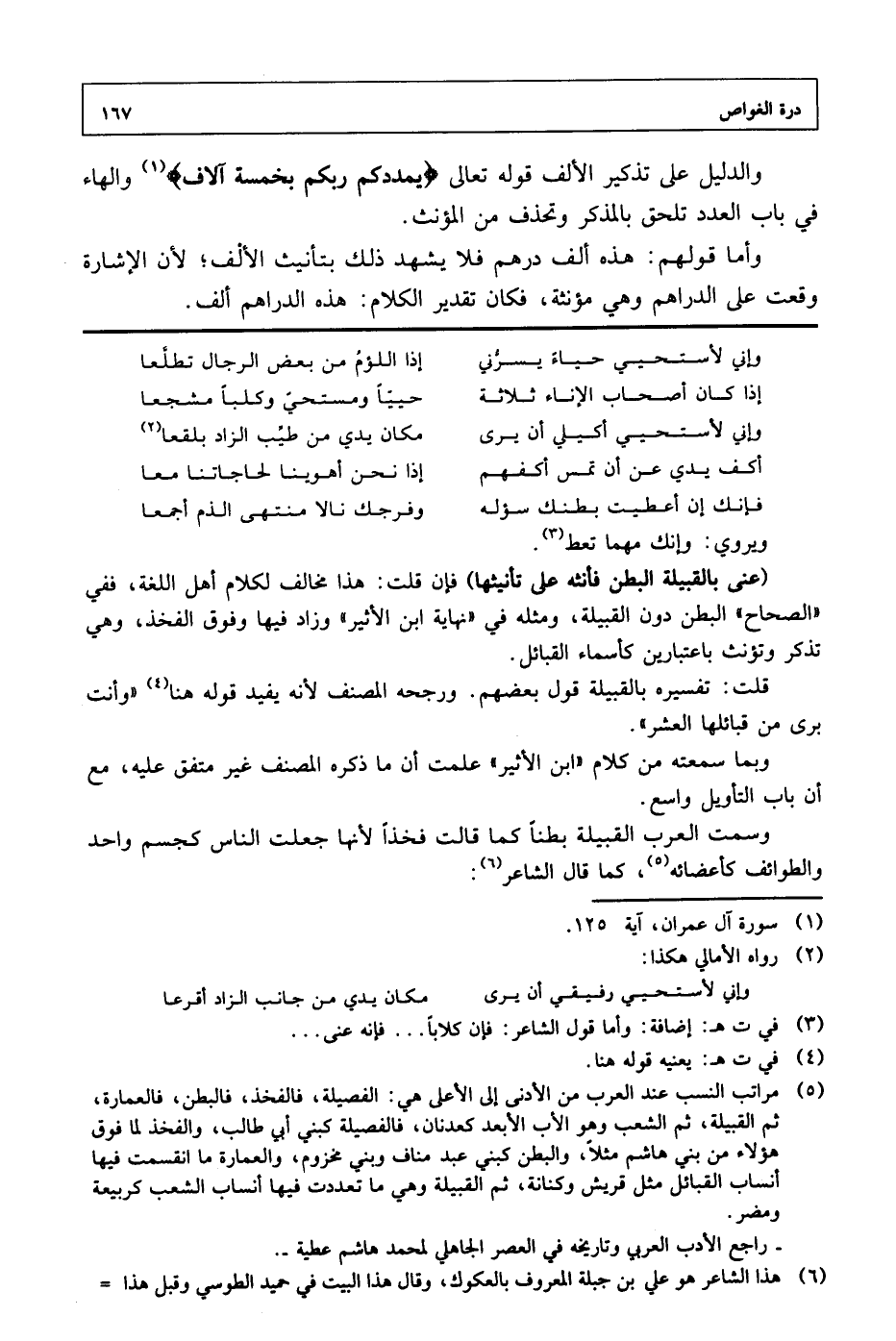 والدليل على تذكير الألف في قوله تعالى {يمددكم ربكم بخمسة آلاف} (آل عمران: 125) والهاء في باب العدد تلحق بالمذكر وتحذف من المؤنث.