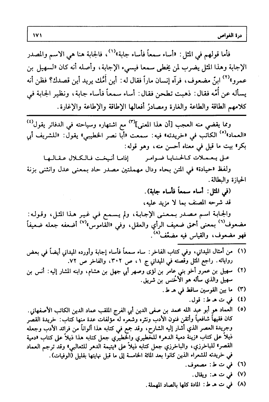 فأما قولهم في المثل: "أساء سمعا فأساء جابة"، فالجابة هنا هي الاسم والمصدر الإجابة وهذا المصل يضرب لمن يخطى سمعا فيسيء الإجابة، وأصله أنه كان "لسهيل بن عمرو" ابن مضعوف، فرآه إنسان مارا فقال له: أين أمك يريد أين قصدك؟ فظن أنه يسأل عن أمه فقال: ذهبت تطحن فقال: أساء سمعا فأساء جابة، ونظير الجابة في كلامهم الطاقة والطاعة والغارة ومصادر أفعالها الإطاقة والإطاعة والإغارة.
