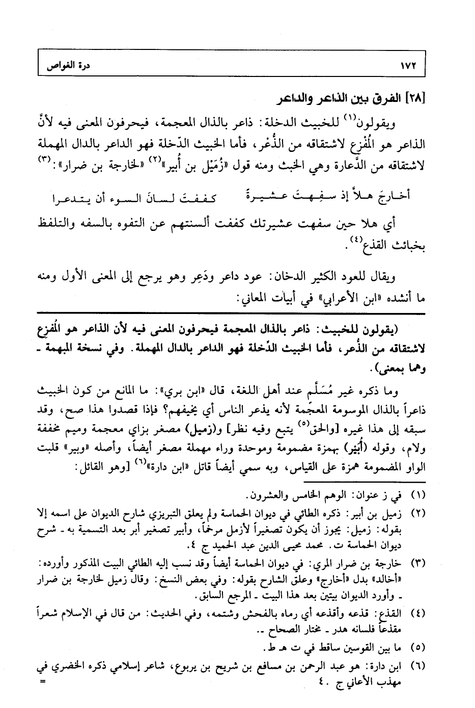 ويقولون للخبيث الداخلة: ذاعر بالذال المعجمة، فيحرفون المعنى فيه لأن الذاعر هو المفزع لاشتقاقه من الذعر، فأما الخبيث الدخلة فهو الداعر بالدال المهملة لاشتقاقه من الدعارة وهي الخبث ومنه قول "زميل بن أبير" "لخارجة بن ضرار":