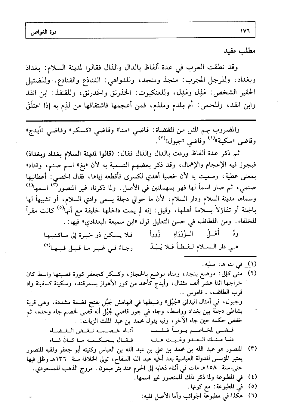 ثم ذكر عدة ألفاظ وردت بالدال والذال فقال: (قالوا لمدينة السلام بغداد وبغداذ) فيجوز فيه الإعجام والإهمال، وقد ذكر بعضهم التسمية به لأن "بغ" اسم صنم، و"داد" بمعنى عطية، وسميت به لأن خصيا أهدي لكسرى فأقطعه إياها، فقال الخصي: أعطانيها صنمي، ثم صار اسما لها فهو بمهملتين في الأصل. ولما ذكرناه غير المنصور اسمها وسماها مدينة السلام ودار السلام، لأن ما حوالي دجلة يسمى وادي السلام، أو تشبيها لها بالجنة أو تفاؤلا بسلامة أهلها، وقيل: إنه لم يمت داخلها خليفة مع أنها كانت مقرا للخلفاء. ومن اللطائف في حسن التعليل قول "ابن سميعة البغدادي" فيها:
