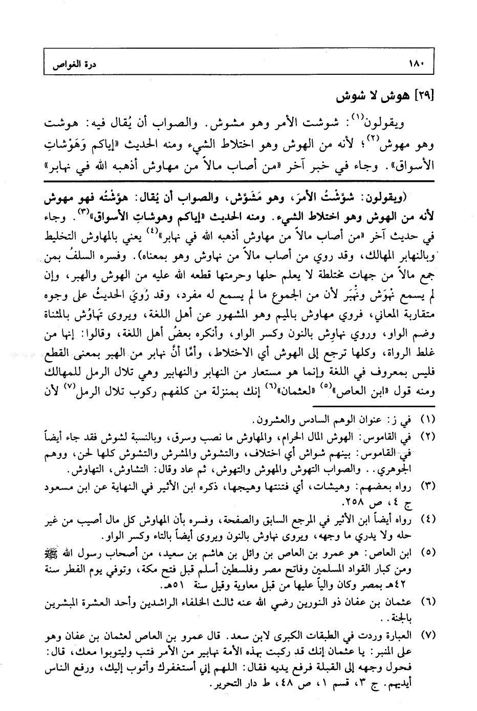 ويقولون: شوشت الأمر وهو مشوش. والصواب أن يقال فيه: هوشت وهو مهوش؛ لأنه من الهوش وهو اختلاط الشيء ومنه الحديث "إياكم وهوشات الأسواق". وجاء في خبر آخر "من أصاب مالا من مهاوش أذهبه الله في نهابر"